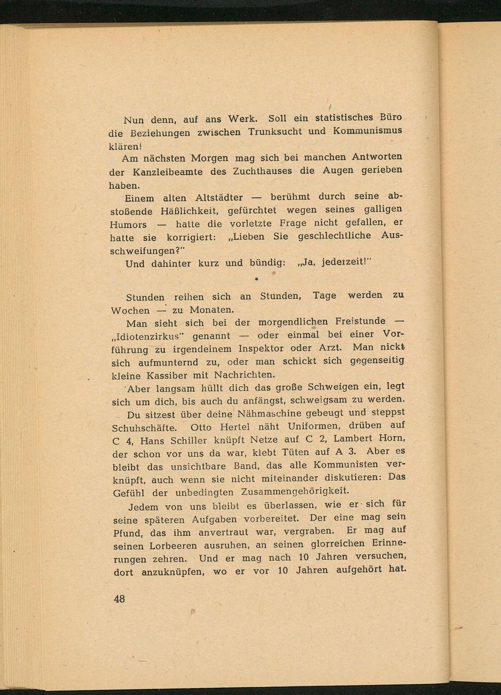 Aber langsam hüllt dich das große Schweigen ein, legt sich um dich, bis auch du anfängst, schweigsam zu werden. Du sitzest über deine Nähmaschine gebeugt und steppst Schuhschäfte. Otto Hertel näht Uniformen, drüben auf C 4, Hans Schiller knüpft Netze auf C 2, Lambert Horn , Aber es der schon vor uns da war, klebt Tüten auf A 3. bleibt das unsichtbare Band, das alle Kommunisten verknüpft, auch wenn sie nicht miteinander diskutieren: Das Gefühl der unbedingten Zusammengehörigkeit.