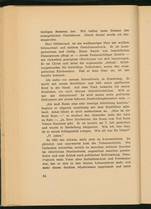 Ich stehe vor seinem Schreibtisch, in Erwartung. spielt mit einem Brieföffner und hält einen geöffneten Brief in der Hand. Auf dem Tisch bemerke ich meine Will er Straftakte, ein noch dünnes Aktenbündelchen. mit mir diskutieren? Es wird meine erste politische Diskussion mit einem höheren Strafvollzugsbeamten sein.