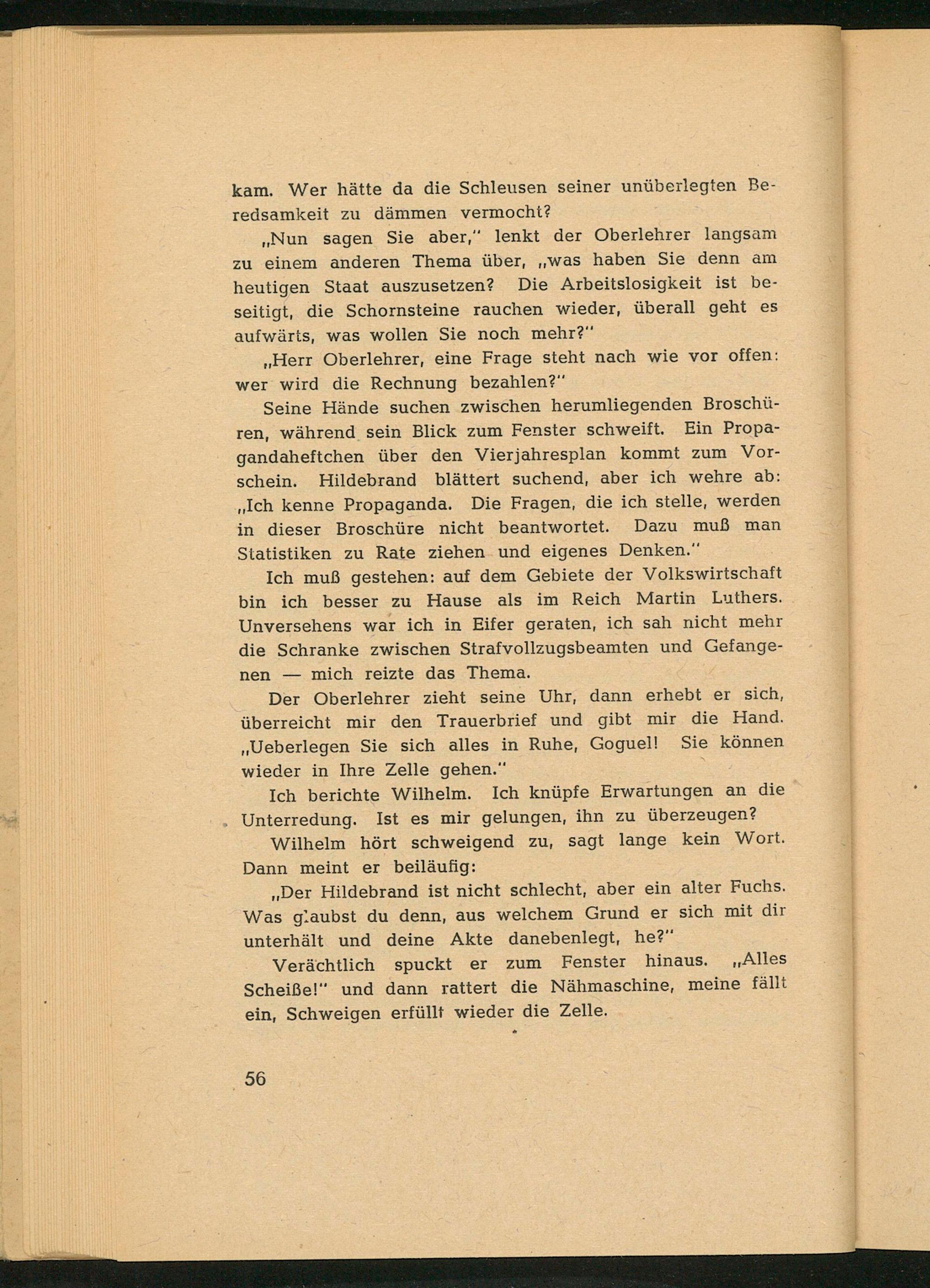 Seine Hände suchen zwischen herumliegenden Broschüren, während sein Blick zum Fenster schweift. Ein Propagandaheftchen über den Vierjahresplan kommt zum Vorschein. Hildebrand blättert suchend, aber ich wehre ab: ,, Ich kenne Propaganda. Die Fragen, die ich stelle, werden in dieser Broschüre nicht beantwortet. Dazu muß man Statistiken zu Rate ziehen und eigenes Denken."
