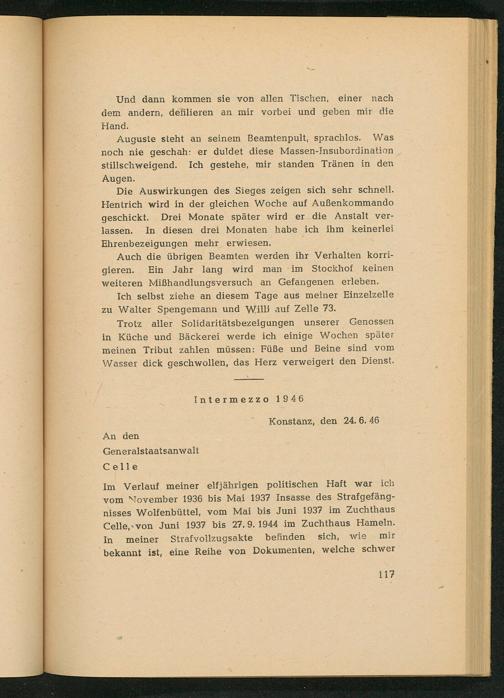 Im Verlauf meiner elfjährigen politischen Haft war ich vom November 1936 bis Mai 1937 Insasse des Strafgefängnisses Wolfenbüttel , vom Mai bis Juni 1937 im Zuchthaus Celle , von Juni 1937 bis 27. 9. 1944 im Zuchthaus Hameln. In befinden mir meiner Strafvollzugsakte sich, wie bekannt ist, eine Reihe von Dokumenten, welche schwer