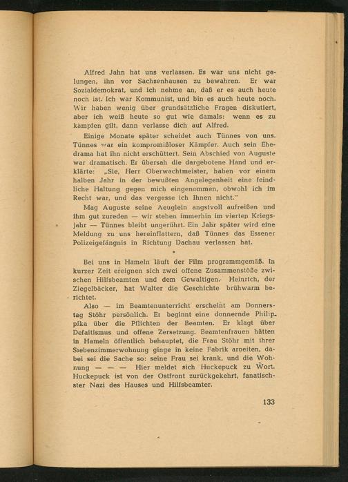 im Beamtenunterricht erscheint am Donnerstag Stöhr persönlich. Er beginnt eine donnernde Philip. pika über die Pflichten der Beamten. Er klagt über Defaitismus und offene Zersetzung. Beamtenfrauen hätten in Hameln öffentlich behauptet, die Frau Stöhr mit ihrer Siebenzimmerwohnung ginge in keine Fabrik arbeiten, dabei sei die Sache so: seine Frau sei krank, und die Wohnung Hier meldet sich Huckepuck zu Wort. Huckepuck ist von der Ostfront zurückgekehrt, fanatischster Nazi des Hauses und Hilfsbeamter.