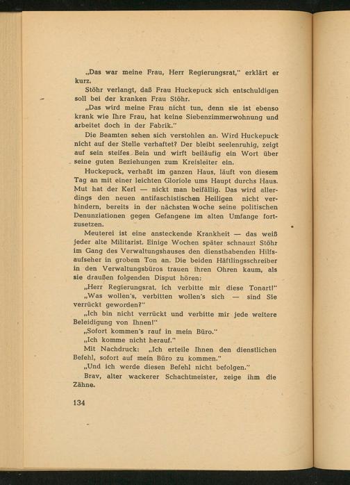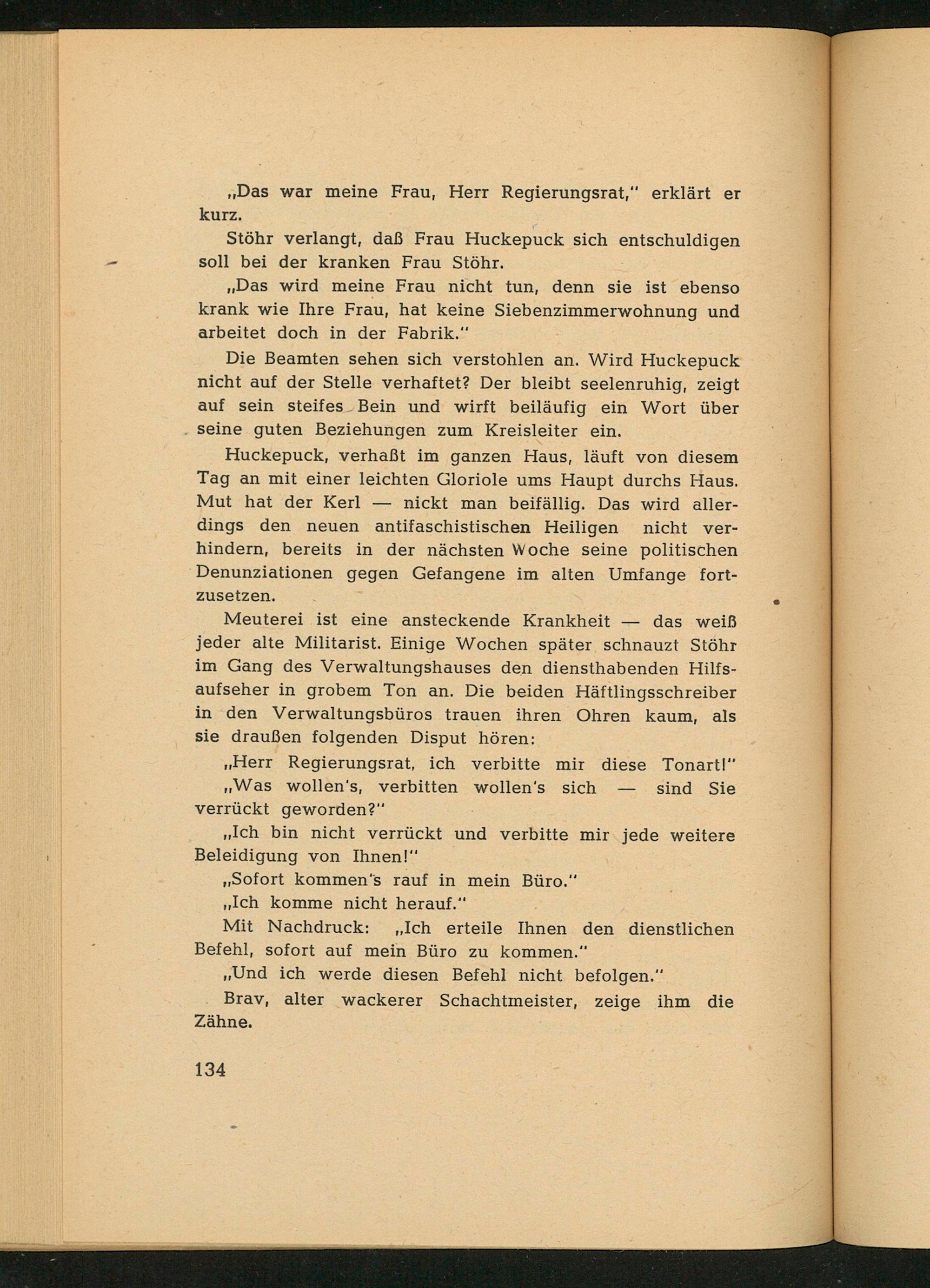 Meuterei ist eine ansteckende Krankheit jeder alte Militarist. Einige Wochen später schnauzt Stöhr im Gang des Verwaltungshauses den diensthabenden Hilfsaufseher in grobem Ton an. Die beiden Häftlingsschreiber in den Verwaltungsbüros trauen ihren Ohren kaum, als sie draußen folgenden Disput hören: