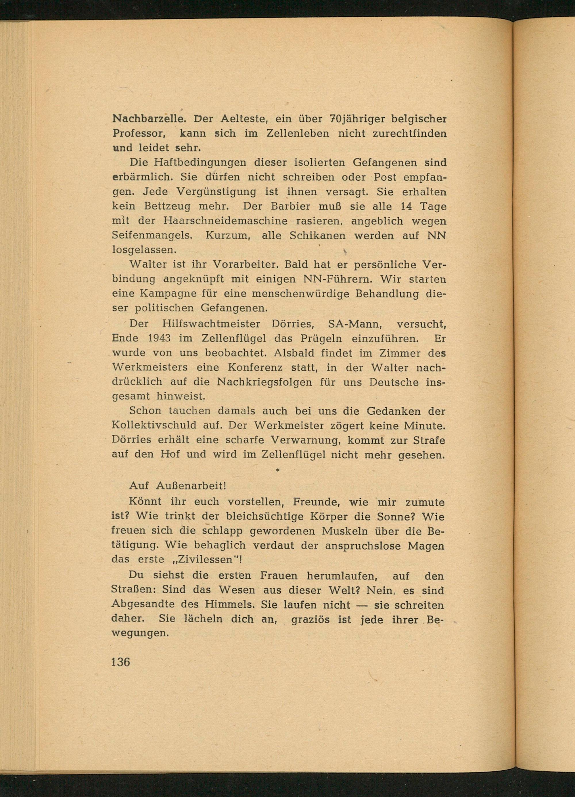 Schon tauchen damals auch bei uns die Gedanken der Kollektivschuld auf. Der Werkmeister zögert keine Minute. Dörries erhält eine scharfe Verwarnung, kommt zur Strafe auf den Hof und wird im Zellenflügel nicht mehr gesehen.