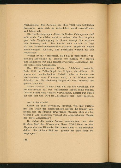 Walter ist ihr Vorarbeiter. Bald hat er persönliche Verbindung angeknüpft mit einigen NN- Führern. Wir starten eine Kampagne für eine menschenwürdige Behandlung dieser politischen Gefangenen.