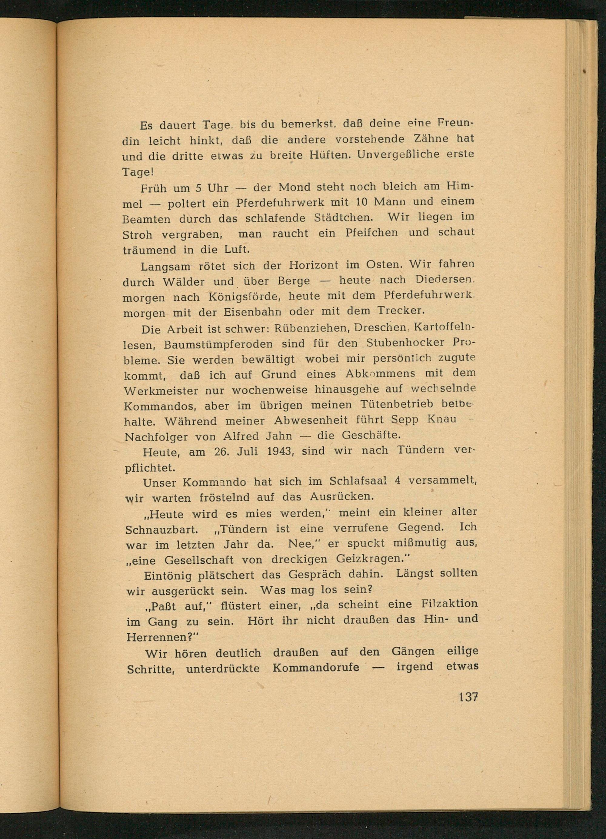 Die Arbeit ist schwer: Rübenziehen, Dreschen, Kartoffelnlesen, Baumstümpferoden sind für den Stubenhocker Probleme. Sie werden bewältigt wobei mir persönlich zugute kommt, daß ich auf Grund eines Abkommens mit dem Werkmeister nur wochenweise hinausgehe auf wechselnde Kommandos, aber im übrigen meinen Tütenbetrieb beibe halte. Während meiner Abwesenheit führt Sepp Knau Nachfolger von Alfred Jahn die Geschäfte.