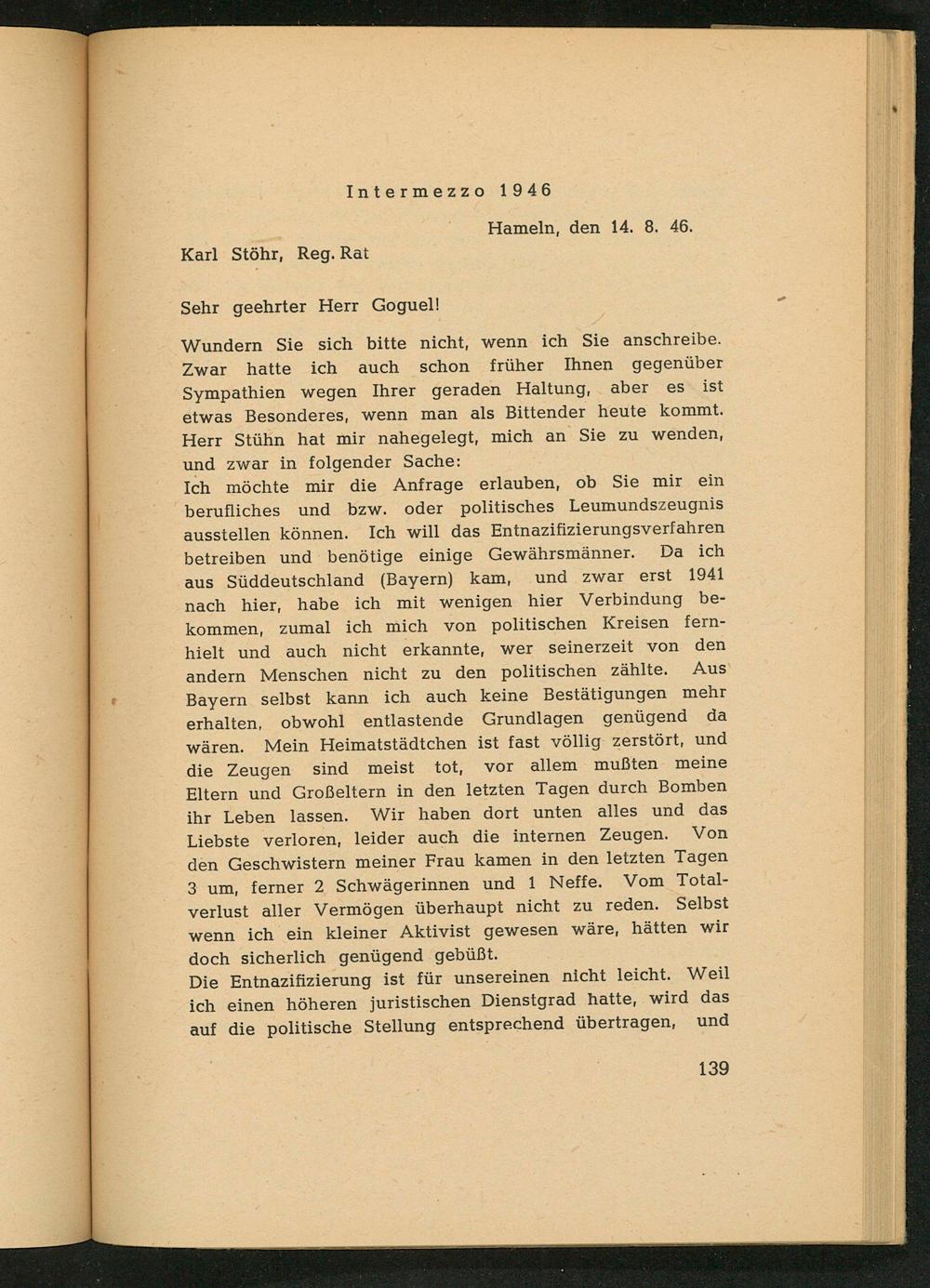 Ich möchte mir die Anfrage erlauben, ob Sie mir ein berufliches und bzw. oder politisches Leumundszeugnis ausstellen können. Ich will das Entnazifizierungsverfahren betreiben und benötige einige Gewährsmänner. und zwar erst 1941 aus Süddeutschland( Bayern ) kam, nach hier, habe ich mit wenigen hier Verbindung bekommen, zumal ich mich von politischen Kreisen fernhielt und auch nicht erkannte, wer seinerzeit von den Aus andern Menschen nicht zu den politischen zählte. Bayern selbst kann ich auch keine Bestätigungen mehr erhalten, obwohl entlastende Grundlagen genügend da wären. Mein Heimatstädtchen ist fast völlig zerstört, und die Zeugen sind meist tot, vor allem mußten meine Eltern und Großeltern in den letzten Tagen durch Bomben ihr Leben lassen. Wir haben dort unten alles und das Von Liebste verloren, leider auch die internen Zeugen. den Geschwistern meiner Frau kamen in den letzten Tagen Vom Total3 um, ferner 2 Schwägerinnen und 1 Neffe. verlust aller Vermögen überhaupt nicht zu reden. Selbst wenn ich ein kleiner Aktivist gewesen wäre, hätten wir doch sicherlich genügend gebüßt.