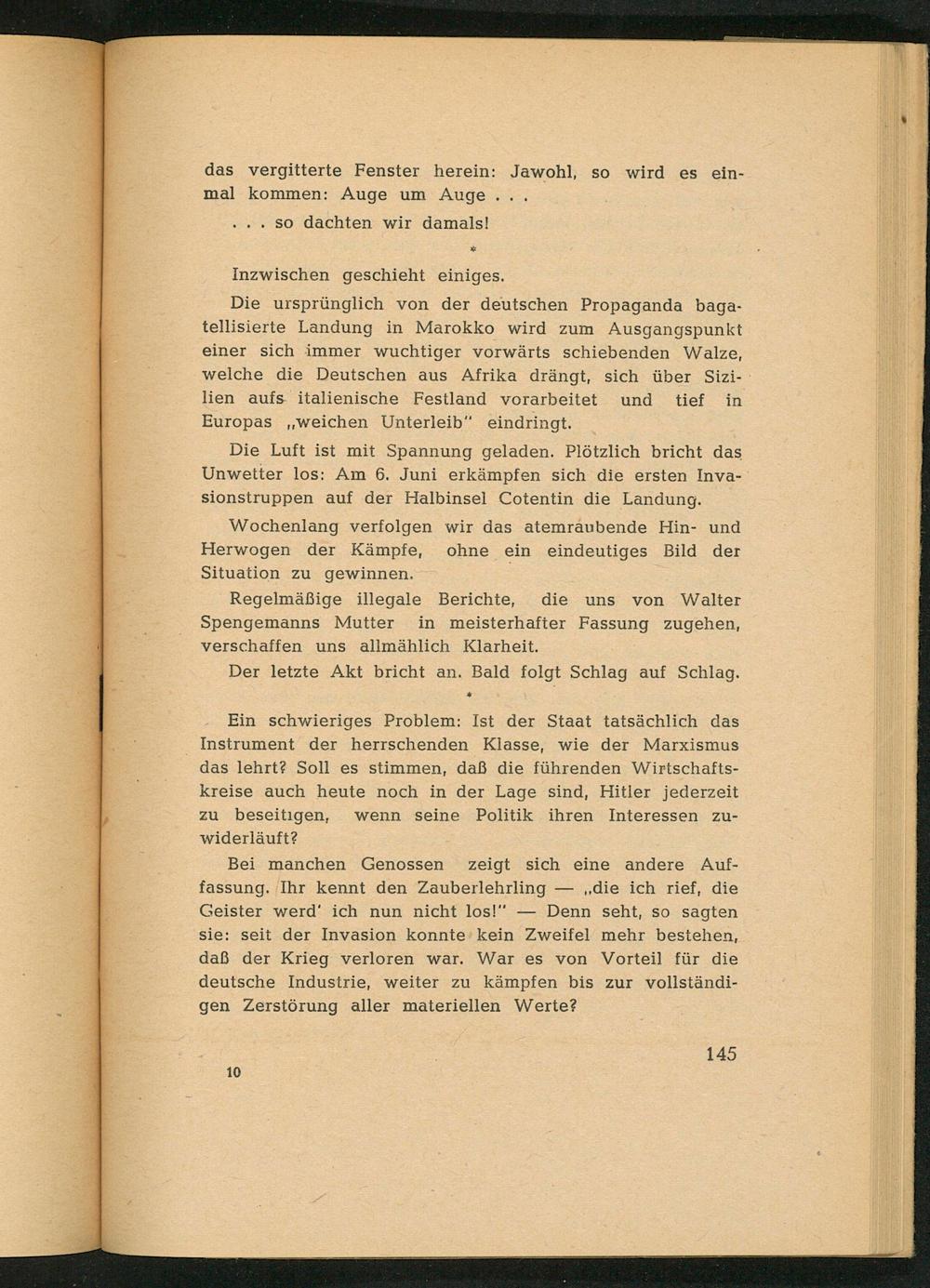 Bei manchen Genossen zeigt sich eine andere Auffassung. Ihr kennt den Zauberlehrling ,, die ich rief, die Geister werd' ich nun nicht los!" Denn seht, so sagten sie: seit der Invasion konnte kein Zweifel mehr bestehen, daß der Krieg verloren war. War es von Vorteil für die deutsche Industrie, weiter zu kämpfen bis zur vollständigen Zerstörung aller materiellen Werte?
