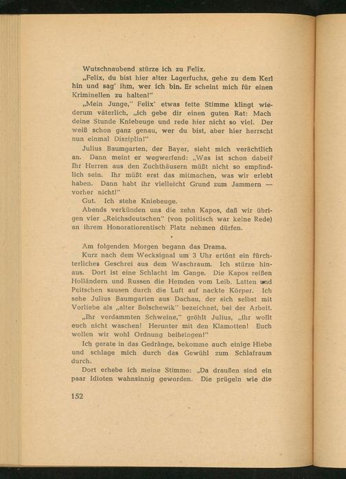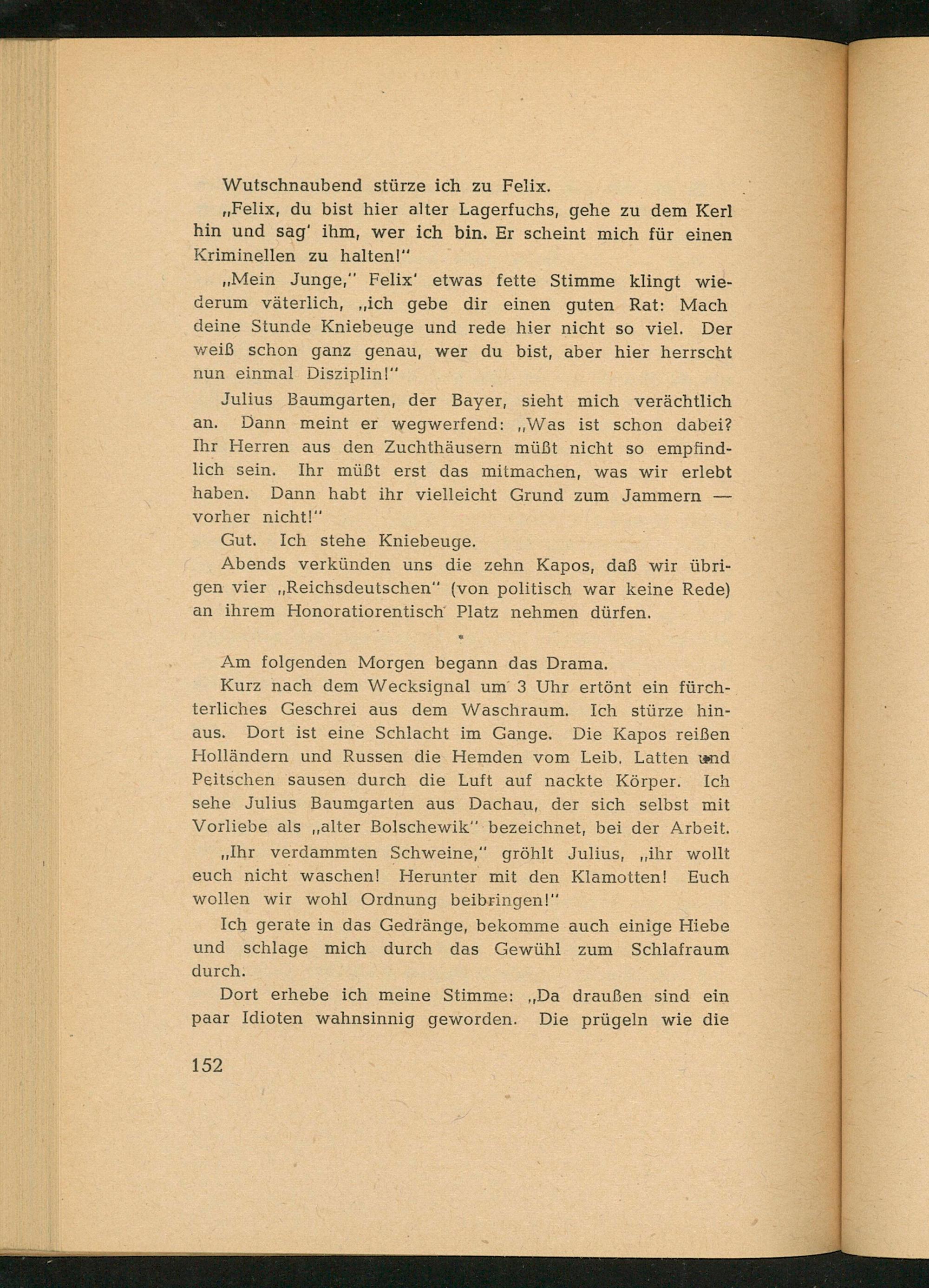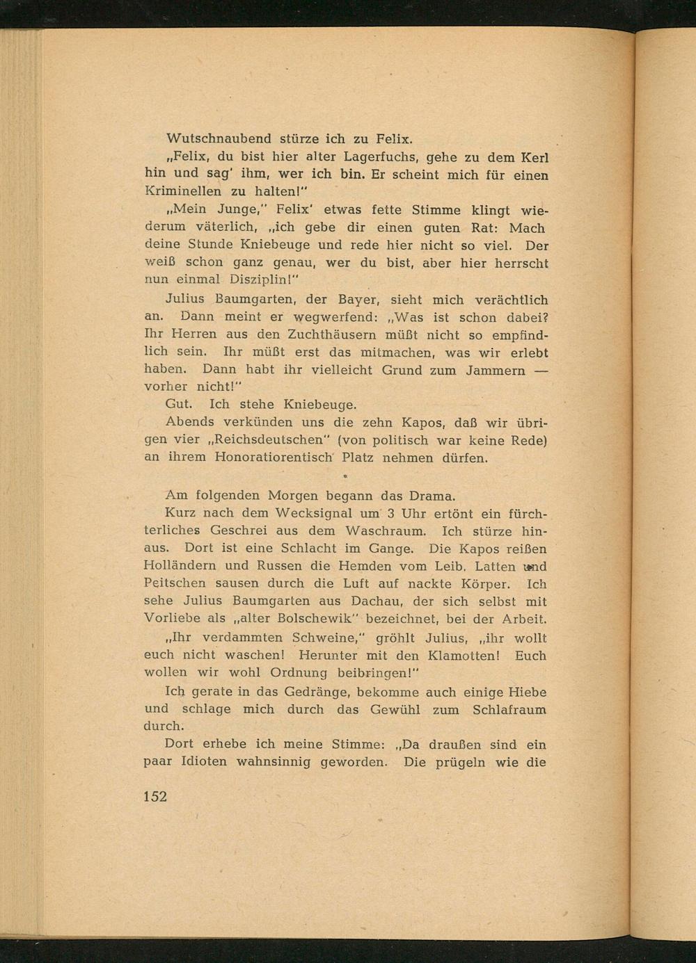 Kurz nach dem Wecksignal um 3 Uhr ertönt ein fürchterliches Geschrei aus dem Waschraum. Ich stürze hinaus. Dort ist eine Schlacht im Gange. Die Kapos reißen Holländern und Russen die Hemden vom Leib. Latten und Peitschen sausen durch die Luft auf nackte Körper. Ich sehe Julius Baumgarten aus Dachau , der sich selbst mit Vorliebe als ,, alter Bolschewik" bezeichnet, bei der Arbeit. ,, Ihr verdammten Schweine," gröhlt Julius ,,, ihr wollt euch nicht waschen! Herunter mit den Klamotten! Euch wollen wir wohl Ordnung beibringen!"