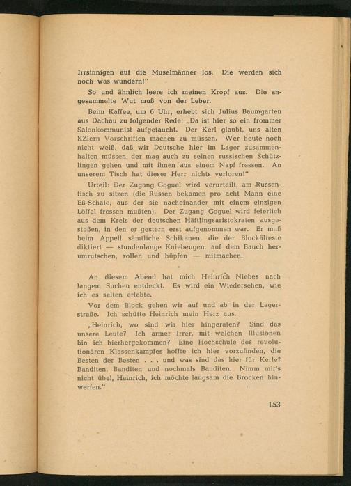 Beim Kaffee, um 6 Uhr, erhebt sich Julius Baumgarten aus Dachau zu folgender Rede:„Da ist hier so ein frommer Salonkommunist aufgetaucht. Der Kerl glaubt, uns alien KZlern Vorschriften machen zu müssen. Wer heute noch nicht weiß, daß wir Deutsche hier im Lager zusammen- halten müssen, der mag auch zu seinen russischen Schütz- lingen gehen und mit ihnen aus einem Napf fressen. An unserem Tisch hat dieser Herr- nichts verloren!"