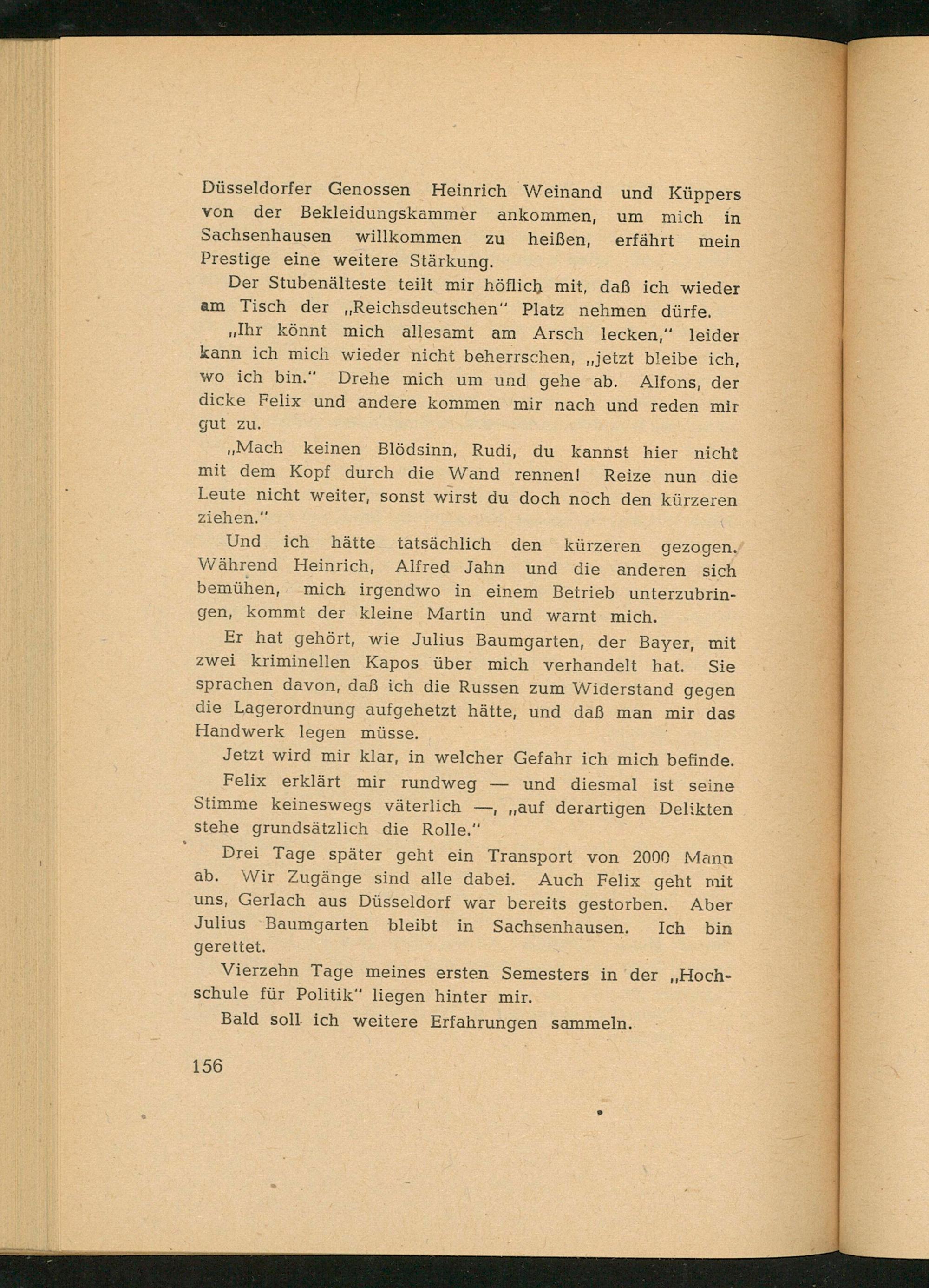 Stimme keineswegs väterlich—,„auf derartigen Delikten stehe grundsätzlich die Rolle.“ / Drei Tage später geht ein Transport von 2000 Mann ab. Wir Zugänge sind alle dabei. Auch Felix geht mit uns, Gerlach aus Düsseldorf war bereits gestorben. Aber Julius Baumgarten bleibt in Sachsenhausen . Ich bin gerettet.