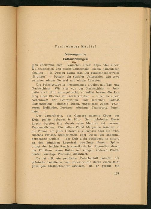Der Lagerälteste, ein Genosse namens Köbes aus Köln , schläft nebenan im Büro. Sein polnischer Hausknecht bereitet ihm abends seine Mahlzeit auf unserem Kanonenöfchen. Ein halbes Pfund Margarine wandert in die Pfanne, ein guter Gulasch aus Büchsen oder ein Stück frisches Fleisch, Bratkartoffeln oder Puree, ein andermal gebackene Nudeln der Duft zieht betäubend in unsere an den stinkigen Lagerfraß gewöhnte Nasen. Später dringt der leichte Rauch amerikanischer Zigaretten durch die Türritzen, wenn Köbes mit einigen anderen Prominenten wichtige Probleme diskutiert.