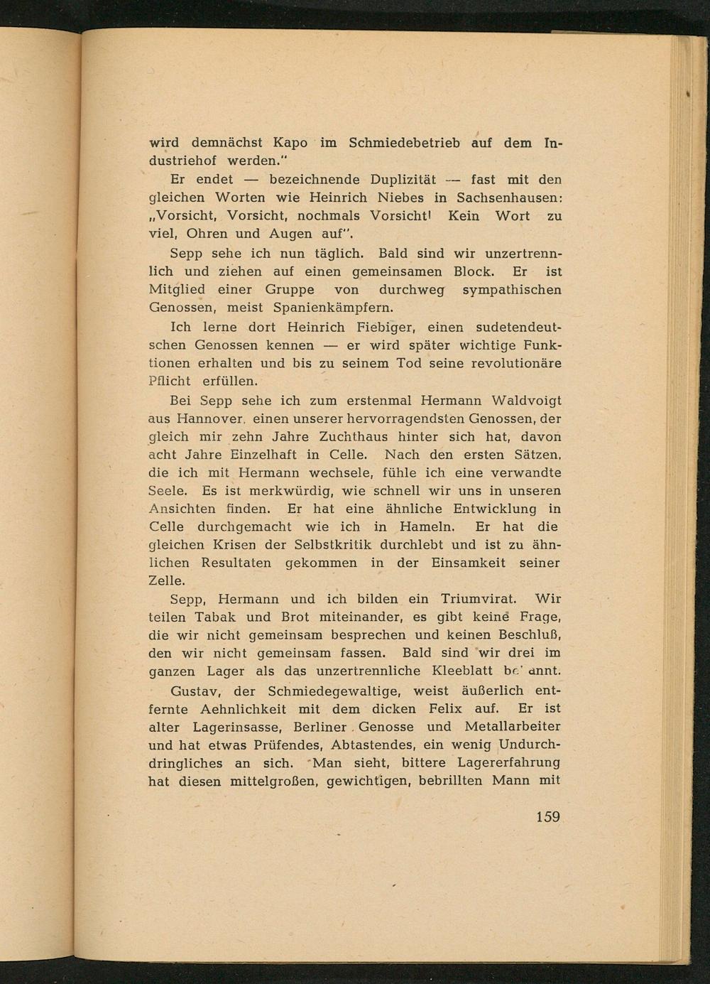 Bei Sepp sehe ich zum erstenmal Hermann Waldvoigt aus Hannover , einen unserer hervorragendsten Genossen, der gleich mir zehn Jahre Zuchthaus hinter sich hat, davon acht Jahre Einzelhaft in Celle . Nach den ersten Sätzen, die ich mit Hermann wechsele, fühle ich eine verwandte Seele. Es ist merkwürdig, wie schnell wir uns in unseren Ansichten finden. Er hat eine ähnliche Entwicklung in Celle durchgemacht wie ich in Hameln . Er hat die gleichen Krisen der Selbstkritik durchlebt und ist zu ähnlichen Resultaten gekommen in der Einsamkeit seiner Zelle.