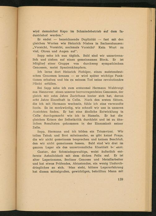 Sepp sehe ich nun täglich. Bald sind wir unzertrennlich und ziehen auf einen gemeinsamen Block. Mitglied einer Gruppe von durchweg sympathischen Genossen, meist Spanienkämpfern.
