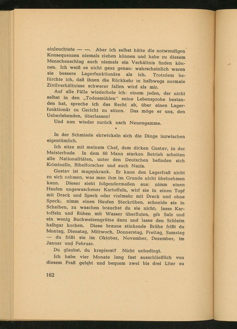 Aber ich selbst hätte die notwendigen Konsequenzen niemals ziehen können und habe zu diesem Menschenschlag auch niemals ein Verhältnis finden können. Ich weiß es nicht ganz genau: wahrscheinlich waren sie bessere Lagerfunktionäre als ich. Trotzdem befürchte ich, daß ihnen die Rückkehr in halbwegs normale Zivilverhältnisse schwerer fallen wird als mir.