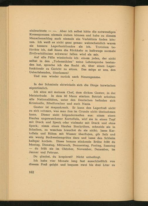 Gustav ist magenkrank. Er kann den Lagerfraß nicht zu sich nehmen, was man ihm im Grunde nicht übelnehmen kann. Dieser sieht folgendermaßen aus: nimm einen Haufen ungewaschener Kartoffeln, wirf sie in einen Topf mit Dreck und Speck oder vielmehr mit Dreck und ohne Speck; nimm einen Haufen Steckrüben, schneide sie in Scheiben, zu waschen brauchst du sie nicht; lasse Kartoffeln und Rüben mit Wasser überfluten, gib Salz und ein wenig Buchweizengrütze dazu und lasse den Schleim halbgar kochen. Diese braune stinkende Brühe friẞt du Montag, Dienstag, Mittwoch, Donnerstag, Freitag, Samstag du friẞt sie im Oktober, November, Dezember, im Januar und Februar.