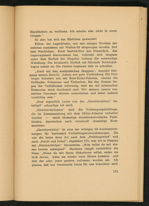 ,, Gewitteraktion" ist eine der witzigen SS- Amtsbezeichnungen für bestimmte Verhaftungsunternehmungen. war die letzte ihrer Art nach dem ,, Frühlingswind“ und nach ,, Nacht und Nebel", abgekürzt NN, was wir in Hameln mit ,, Nazinachfolger" übersetzten. ,, Was willst du mit diesen Leuten anfangen?" Hermann rümpft verächtlich die Nase. Wenn du mit ihnen diskutieren willst, reden sie und bloß davon, wann sie wieder nach Hause kommen Ich daß der oder jener gestern entlassen worden sei. glaube, daß nur vereinzelte Leute für uns brauchbar sind.