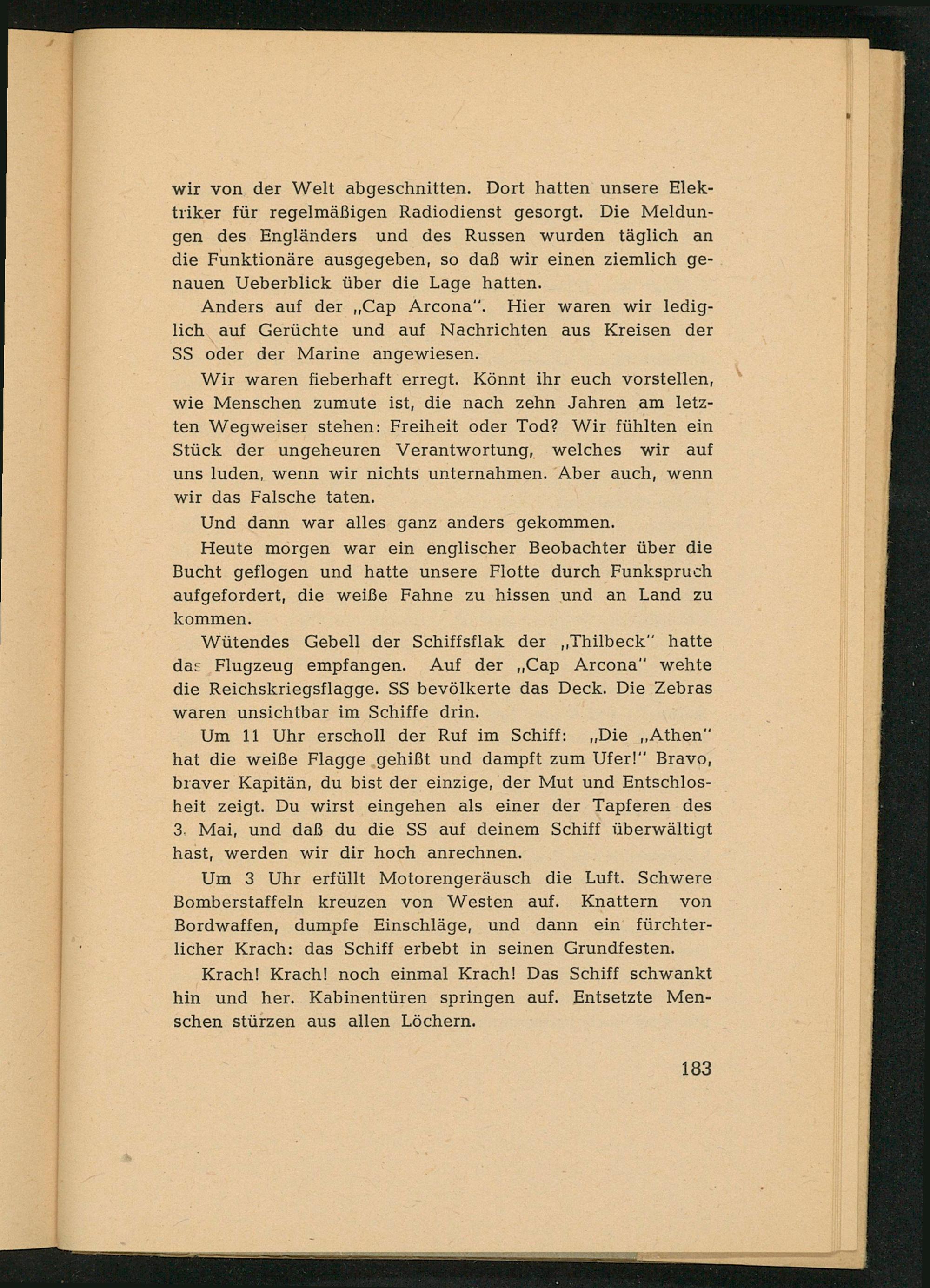 Wütendes Gebell der Schiffsflak der ,, Thilbeck" hatte das Flugzeug empfangen. Auf der ,, Cap Arcona " wehte die Reichskriegsflagge. SS bevölkerte das Deck. Die Zebras waren unsichtbar im Schiffe drin.