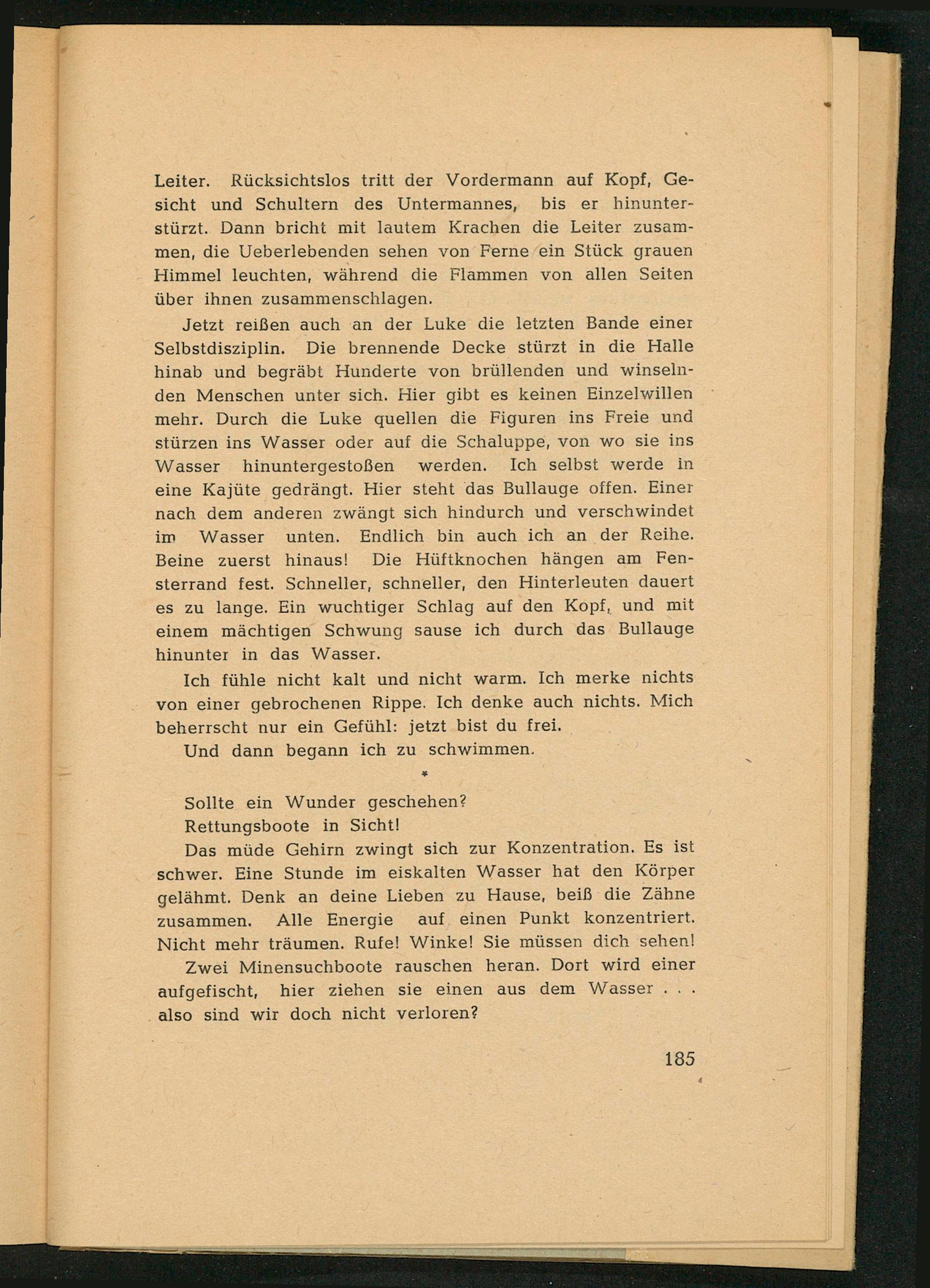 Jetzt reißen auch an der Luke die letzten Bande einer Selbstdisziplin. Die brennende Decke stürzt in die Halle hinab und begräbt Hunderte von brüllenden und winselnden Menschen unter sich. Hier gibt es keinen Einzelwillen mehr. Durch die Luke quellen die Figuren ins Freie und stürzen ins Wasser oder auf die Schaluppe, von wo sie ins Wasser hinuntergestoßen werden. Ich selbst werde in eine Kajüte gedrängt. Hier steht das Bullauge offen. Einer nach dem anderen zwängt sich hindurch und verschwindet im Wasser unten. Endlich bin auch ich an der Reihe. Beine zuerst hinaus! Die Hüftknochen hängen am Fensterrand fest. Schneller, schneller, den Hinterleuten dauert es zu lange. Ein wuchtiger Schlag auf den Kopf, und mit einem mächtigen Schwung sause ich durch das Bullauge hinunter in das Wasser.