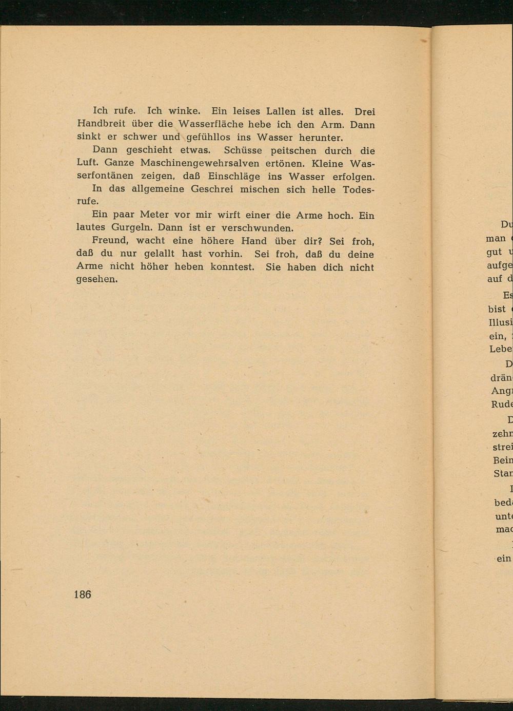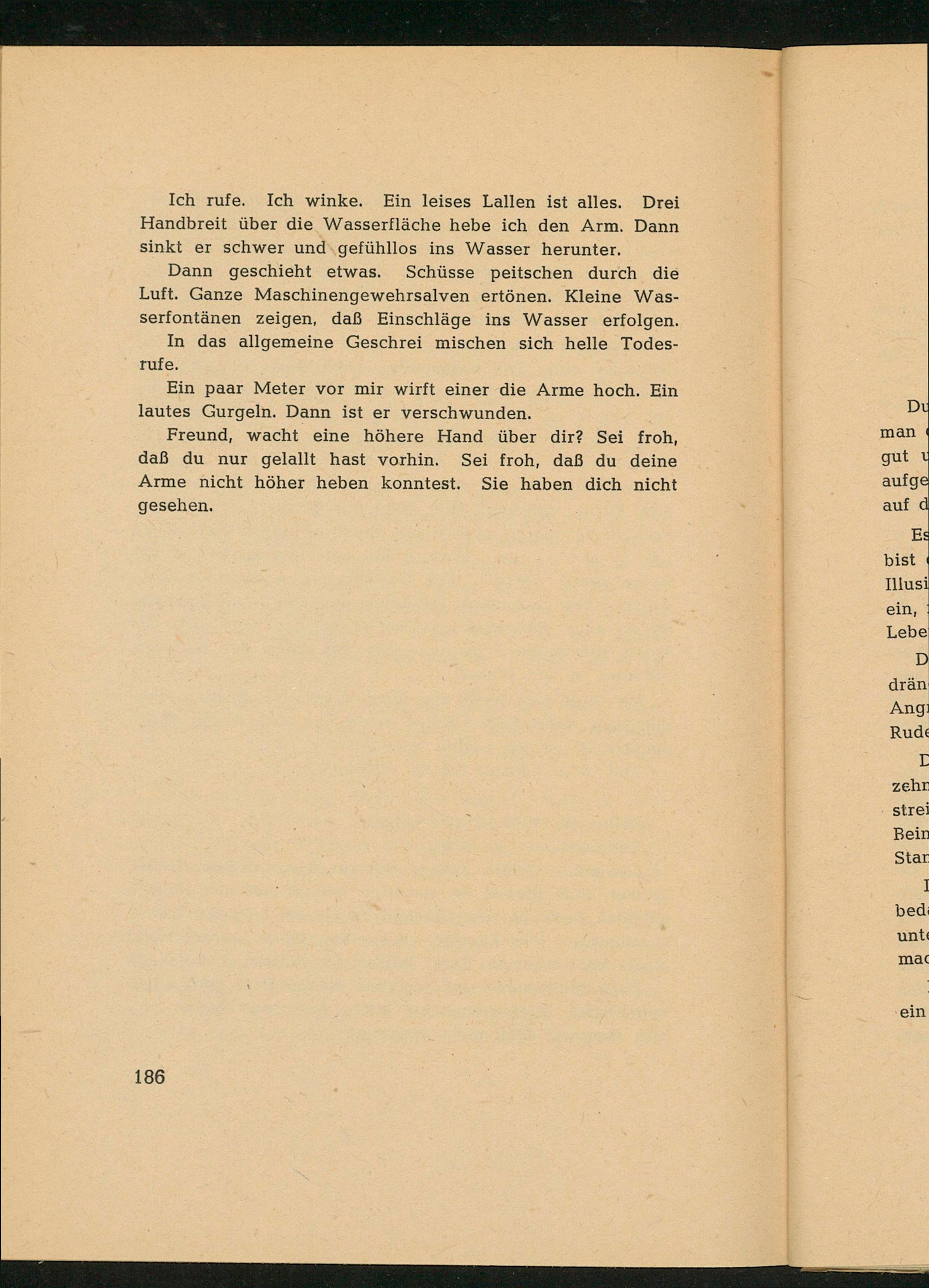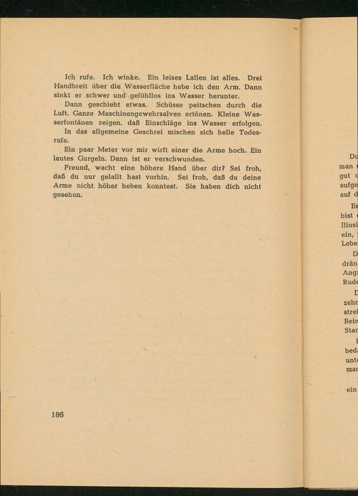 Ich rufe. Ich winke. Ein leises Lallen ist alles. Drei Handbreit über die Wasserfläche hebe ich den Arm. Dann sinkt er schwer und.gefühllos ins Wasser herunter.