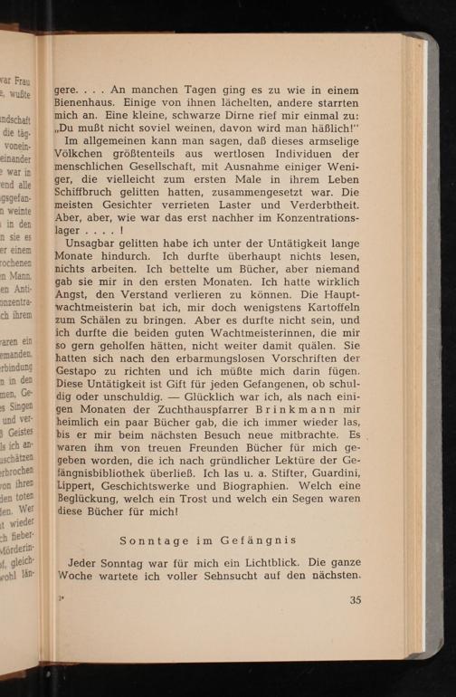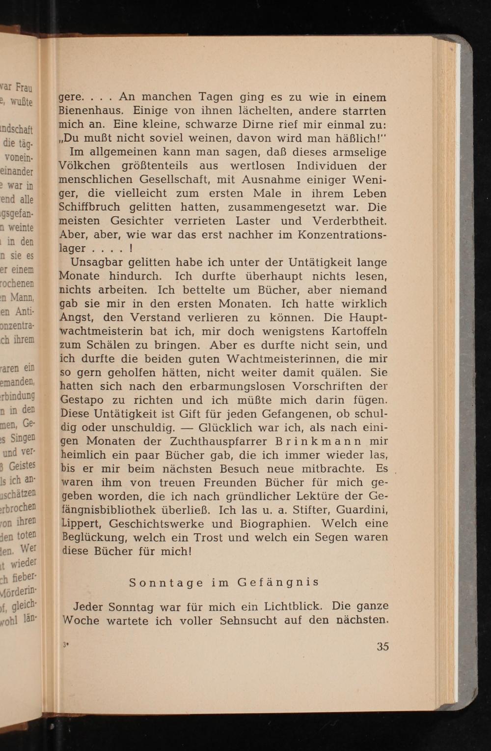 Unsagbar gelitten habe ich unter der Untätigkeit lange Monate hindurch. Ich durfte überhaupt nichts lesen, nichts arbeiten. Ich bettelte um Bücher, aber niemand gab sie mir in den ersten Monaten. Ich hatte wirklich Angst, den Verstand verlieren zu können. Die Hauptwachtmeisterin bat ich, mir doch wenigstens Kartoffeln zum Schälen zu bringen. Aber es durfte nicht sein, und ich durfte die beiden guten Wachtmeisterinnen, die mir so gern geholfen hätten, nicht weiter damit quälen. Sie hatten sich nach den erbarmungslosen Vorschriften der Gestapo zu richten und ich müßte mich darin fügen. Diese Untätigkeit ist Gift für jeden Gefangenen, ob schuldig oder unschuldig. Glücklich war ich, als nach einigen Monaten der Zuchthauspfarrer Brinkmann mir heimlich ein paar Bücher gab, die ich immer wieder las, bis er mir beim nächsten Besuch neue mitbrachte. Es waren ihm von treuen Freunden Bücher für mich gegeben worden, die ich nach gründlicher Lektüre der Gefängnisbibliothek überließ. Ich las u. a. Stifter, Guardini, Lippert, Geschichtswerke und Biographien. Welch eine Beglückung, welch ein Trost und welch ein Segen waren diese Bücher für mich!