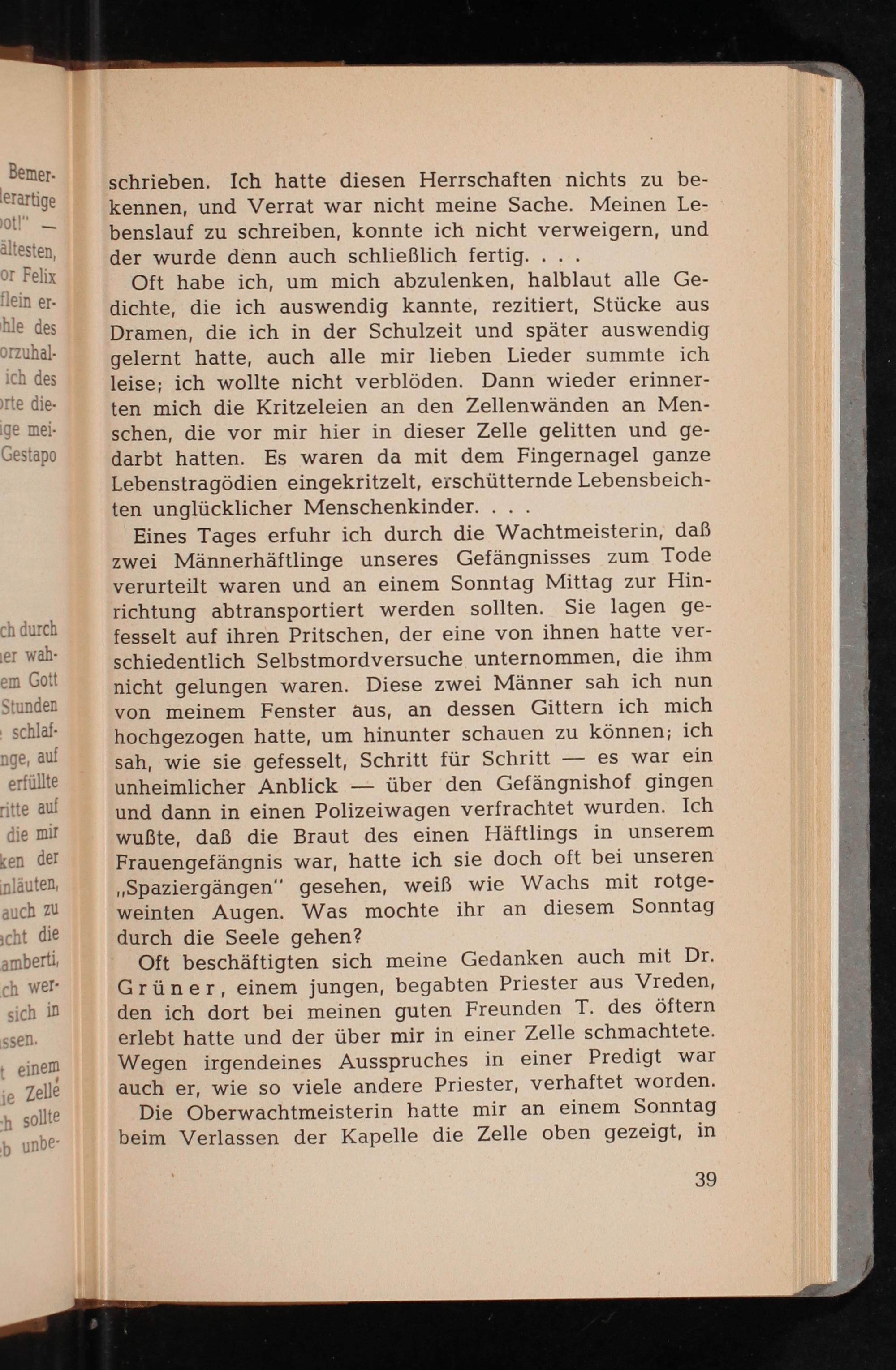 Oft beschäftigten sich meine Gedanken auch mit Dr Grüner, einem jungen, begabten Priester aus Vreden , den ich dort bei meinen guten Freunden T. des öftern erlebt hatte und der über mir in einer Zelle schmachtete. Wegen irgendeines Ausspruches in einer Predigt war auch er, wie so viele andere Priester, verhaftet worden.