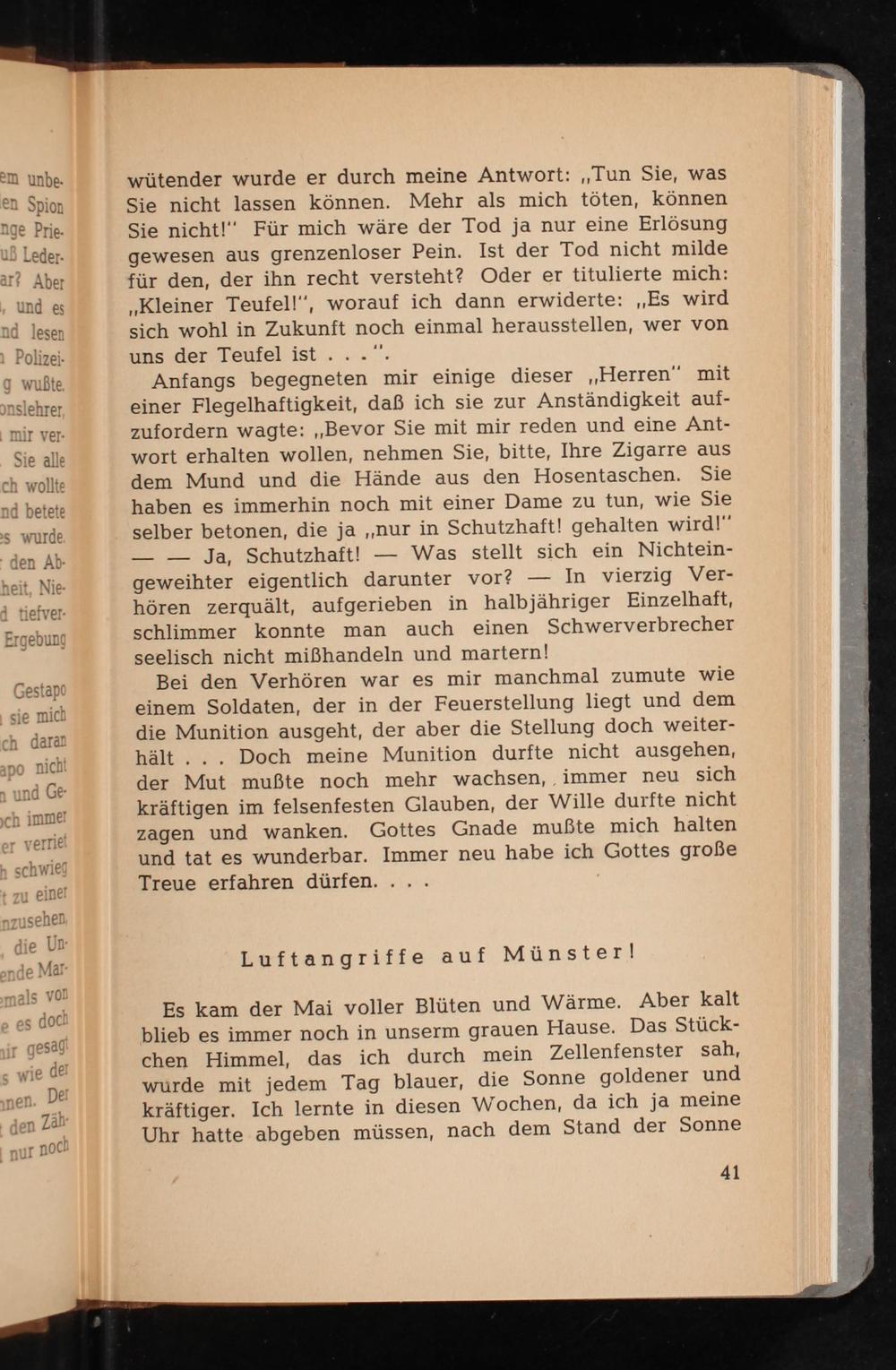 Bei den Verhören war es mir manchmal zumute wie einem Soldaten, der in der Feuerstellung liegt und dem die Munition ausgeht, der aber die Stellung doch weiter- hält... Doch meine Munition durfte nicht ausgehen, der Mut mußte noch mehr wachsen, immer neu sich kräftigen im felsenfesten Glauben, der Wille durfte nicht zagen und wanken. Gottes Gnade mußte mich halten und tat es wunderbar. Immer neu habe ich Gottes große Treue erfahren dürfen....