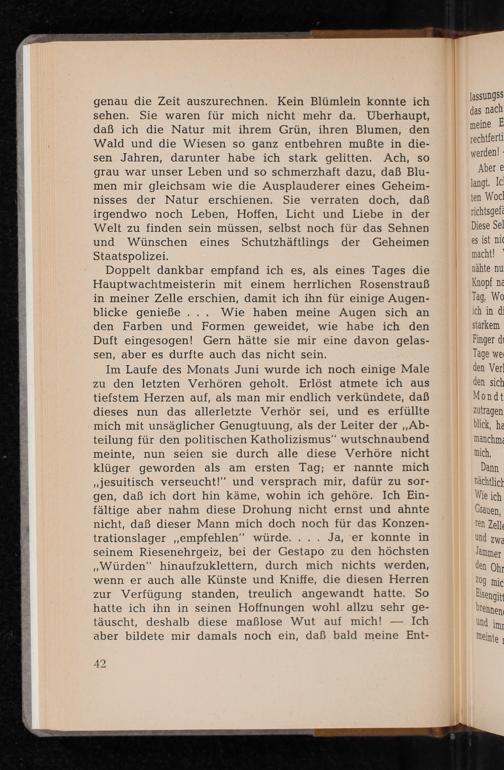 Im Laufe des Monats Juni wurde ich noch einige Male zu den letzten Verhören geholt. Erlöst atmete ich aus tiefstem Herzen auf, als man mir endlich verkündete, daß dieses nun das allerletzte Verhör sei, und es erfüllte mich mit unsäglicher Genugtuung, als der Leiter der ,, Abteilung für den politischen Katholizismus" wutschnaubend meinte, nun seien sie durch alle diese Verhöre nicht klüger geworden als am ersten Tag; er nannte mich ,, jesuitisch verseucht!" und versprach mir, dafür zu sorgen, daß ich dort hin käme, wohin ich gehöre. Ich Einfältige aber nahm diese Drohung nicht ernst und ahnte nicht, daß dieser Mann mich doch noch für das Konzentrationslager ,, empfehlen" würde.... Ja, er konnte in seinem Riesenehrgeiz, bei der Gestapo zu den höchsten , Würden" hinaufzuklettern, durch mich nichts werden, wenn er auch alle Künste und Kniffe, die diesen Herren zur Verfügung standen, treulich angewandt hatte. So hatte ich ihn in seinen Hoffnungen wohl allzu sehr getäuscht, deshalb diese maßlose Wut auf mich! aber bildete mir damals noch ein, daß bald meine Ent