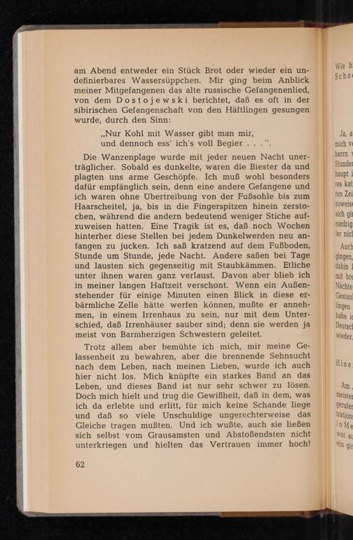 am Abend entweder ein Stück Brot oder wieder ein undefinierbares Wassersüppchen. Mir ging beim Anblick meiner Mitgefangenen das alte russische Gefangenenlied, von dem Dostojewski berichtet, daß es oft in der sibirischen Gefangenschaft von den Häftlingen gesungen wurde, durch den Sinn: