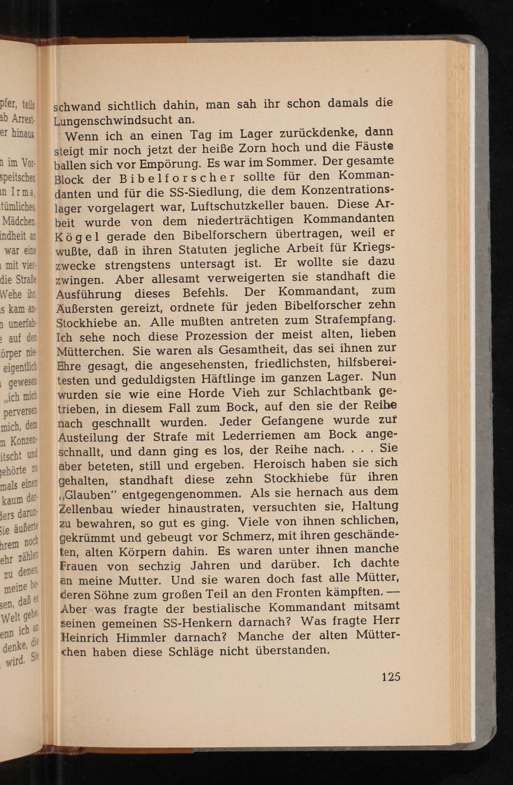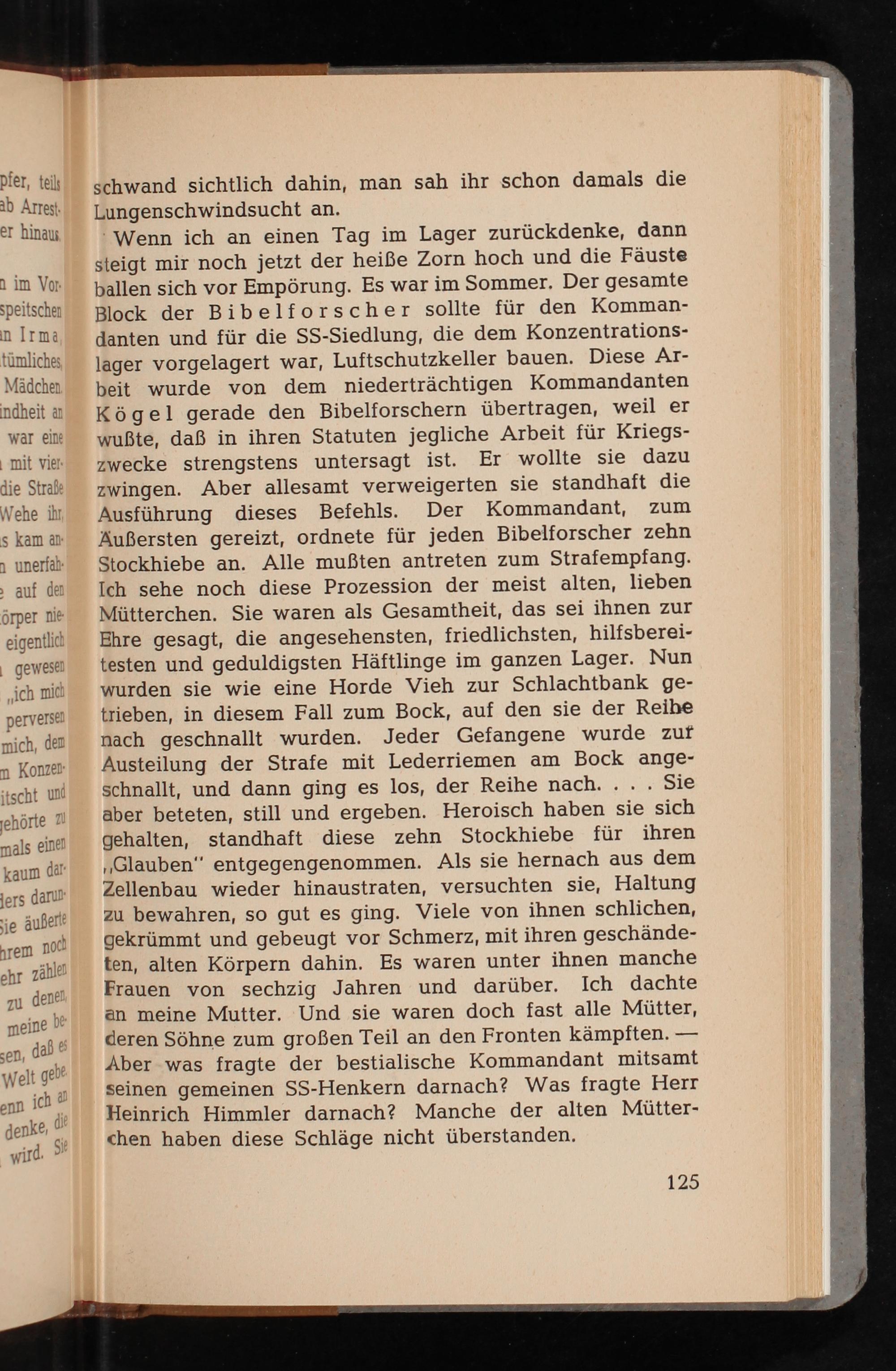 Wenn ich an einen Tag im Lager zurückdenke, dann steigt mir noch jetzt der heiße Zorn hoch und die Fäuste ballen sich vor Empörung. Es war im Sommer. Der gesamte Block der Bibelforscher sollte für den Kommandanten und für die SS- Siedlung, die dem Konzentrationslager vorgelagert war, Luftschutzkeller bauen. Diese Arbeit wurde von dem niederträchtigen Kommandanten Kögel gerade den Bibelforschern übertragen, weil er wußte, daß in ihren Statuten jegliche Arbeit für Kriegszwecke strengstens untersagt ist. Er wollte sie dazu zwingen. Aber allesamt verweigerten sie standhaft die Ausführung dieses Befehls. Der Kommandant, Äußersten gereizt, ordnete für jeden Bibelforscher zehn Stockhiebe an. Alle mußten antreten zum Strafempfang. Ich sehe noch diese Prozession der meist alten, lieben Mütterchen. Sie waren als Gesamtheit, das sei ihnen zur Ehre gesagt, die angesehensten, friedlichsten, hilfsbereitesten und geduldigsten Häftlinge im ganzen Lager. Nun wurden sie wie eine Horde Vieh zur Schlachtbank getrieben, in diesem Fall zum Bock, auf den sie der Reihe nach geschnallt wurden. Jeder Gefangene wurde zur Austeilung der Strafe mit Lederriemen am Bock angeschnallt, und dann ging es los, der Reihe nach.... Sie aber beteten, still und ergeben. Heroisch haben sie sich gehalten, standhaft diese zehn Stockhiebe für ihren ,, Glauben" entgegengenommen. Als sie hernach aus dem Zellenbau wieder hinaustraten, versuchten sie, Haltung zu bewahren, so gut es ging. Viele von ihnen schlichen, gekrümmt und gebeugt vor Schmerz, mit ihren geschändeten, alten Körpern dahin. Es waren unter ihnen manche Frauen von sechzig Jahren und darüber. Ich dachte an meine Mutter. Und sie waren doch fast alle Mütter, deren Söhne zum großen Teil an den Fronten kämpften. Aber was fragte der bestialische Kommandant mitsamt seinen gemeinen SS - Henkern darnach? Was fragte Herr Heinrich Himmler darnach? Manche der alten Mütterchen haben diese Schläge nicht überstanden.