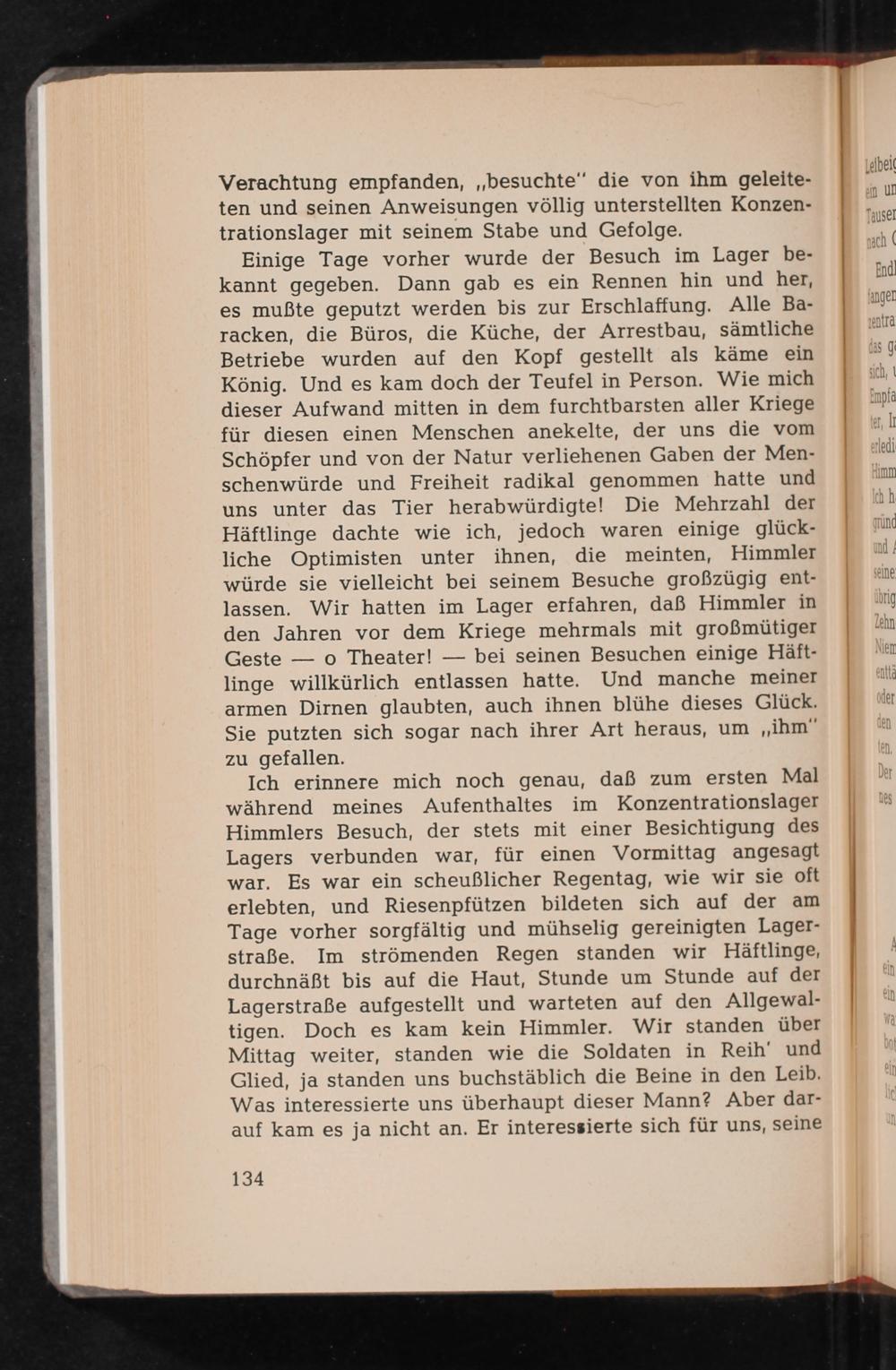Ich erinnere mich noch genau, daß zum ersten Mal während meines Aufenthaltes im Konzentrationslager Himmlers Besuch, der stets mit einer Besichtigung des Lagers verbunden war, für einen Vormittag angesagt war. Es war ein scheußlicher Regentag, wie wir sie oft erlebten, und Riesenpfützen bildeten sich auf der am Tage vorher sorgfältig und mühselig gereinigten Lagerstraße. Im strömenden Regen standen wir Häftlinge, durchnäẞt bis auf die Haut, Stunde um Stunde auf der Lagerstraße aufgestellt und warteten auf den Allgewaltigen. Doch es kam kein Himmler. Wir standen über Mittag weiter, standen wie die Soldaten in Reih' und Glied, ja standen uns buchstäblich die Beine in den Leib. Was interessierte uns überhaupt dieser Mann? Aber darauf kam es ja nicht an. Er interessierte sich für uns, seine