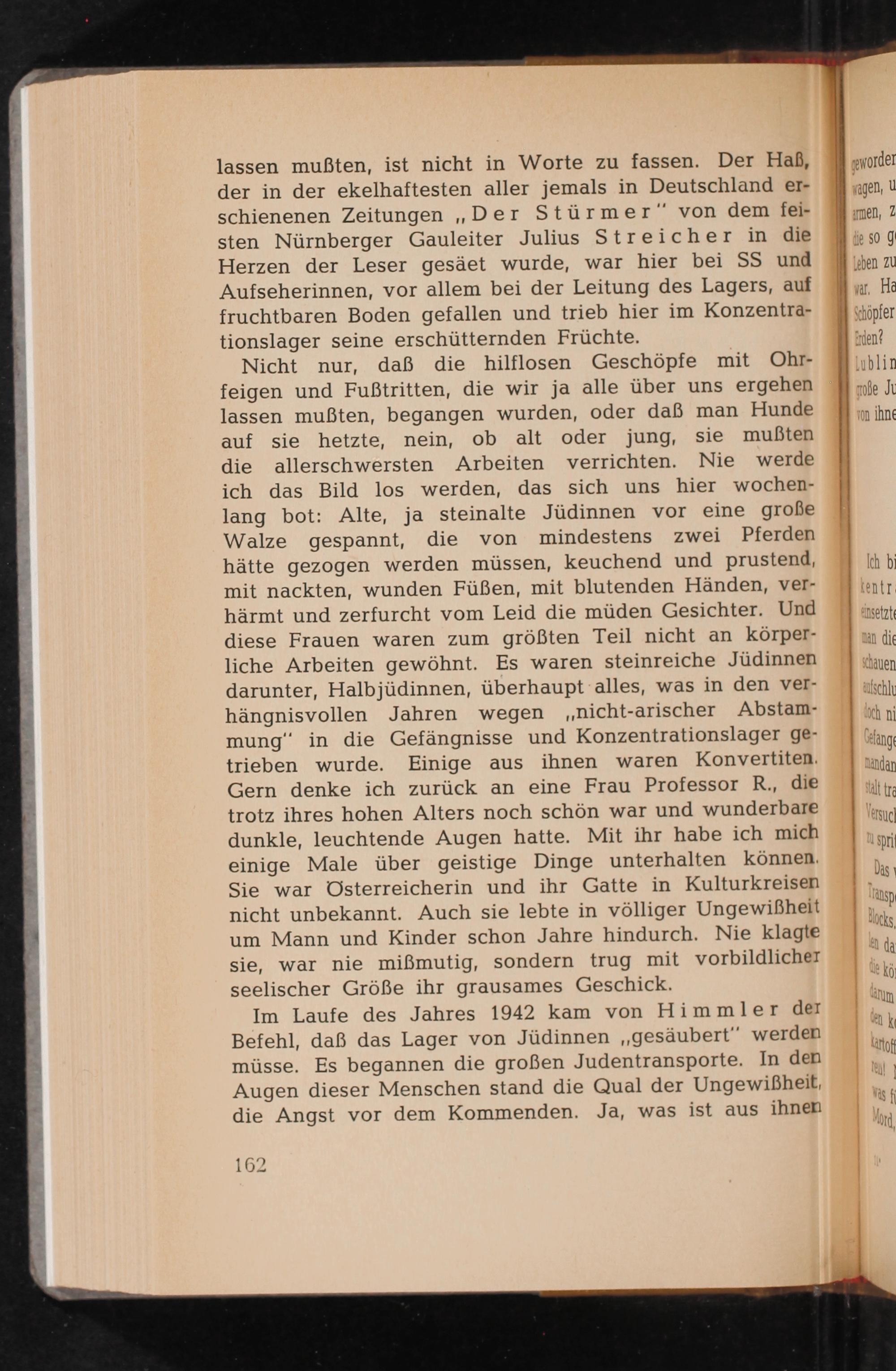 lassen mußten, ist nicht in Worte zu fassen. Der Haß, der in der ekelhaftesten aller jemals in Deutschland erschienenen Zeitungen ,, Der Stürmer " von dem feisten Nürnberger Gauleiter Julius Streicher in die Herzen der Leser gesäet wurde, war hier bei SS und Aufseherinnen, vor allem bei der Leitung des Lagers, auf fruchtbaren Boden gefallen und trieb hier im Konzentrationslager seine erschütternden Früchte.