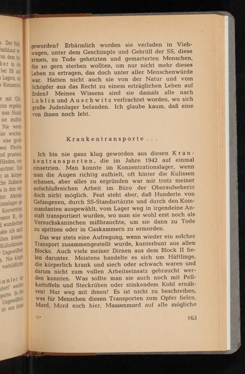 Ich bin nie ganz klug geworden aus diesen Kran- kentransporten, die im Jahre 1942 auf einmal einsetzten. Man konnte im Konzentrationslager, wenn man die Augen richtig aufhielt, oft hinter die Kulissen schauen, aber alles zu ergründen war mir trotz meiner aufschlußreichen Arbeit im Büro der Oberaufseherin doch nicht möglich. Fest steht aber, daß Hunderte von Gefangenen, durch SS - Standortärzte und durch den Kommandanten ausgewählt, vom Lager weg in irgendeine Anstalt transportiert wurden, wo man sie wohl erst noch als Versuchskaninchen mißbrauchte, um sie dann zu Tode zu spritzen oder in Gaskammern zu ermorden.