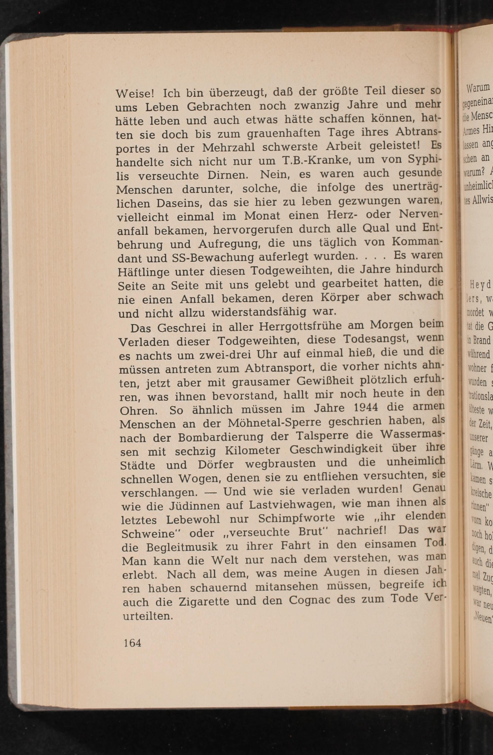 Das Geschrei in aller Herrgottsfrühe am Morgen beim Verladen dieser Todgeweihten, diese Todesangst, wenn es nachts um zwei- drei Uhr auf einmal hieß, die und die müssen antreten zum Abtransport, die vorher nichts ahnten, jetzt aber mit grausamer Gewißheit plötzlich erfuhren, was ihnen bevorstand, hallt mir noch heute in den Ohren. So ähnlich müssen im Jahre 1944 die armen Menschen an der Möhnetal- Sperre geschrien haben, als nach der Bombardierung der Talsperre die Wassermassen mit sechzig Kilometer Geschwindigkeit über ihre Städte und Dörfer wegbrausten und die unheimlich schnellen Wogen, denen sie zu entfliehen versuchten, sie verschlangen. Und wie sie verladen wurden! Genau wie die Jüdinnen auf Lastviehwagen, wie man ihnen als letztes Lebewohl nur Schimpfworte wie ,, ihr elenden Schweine" oder„, verseuchte Brut" nachrief! Das war die Begleitmusik zu ihrer Fahrt in den einsamen Tod. Man kann die Welt nur nach dem verstehen, was man erlebt. Nach all dem, was meine Augen in diesen Jahren haben schauernd mitansehen müssen, begreife ich auch die Zigarette und den Cognac des zum Tode Verurteilten.