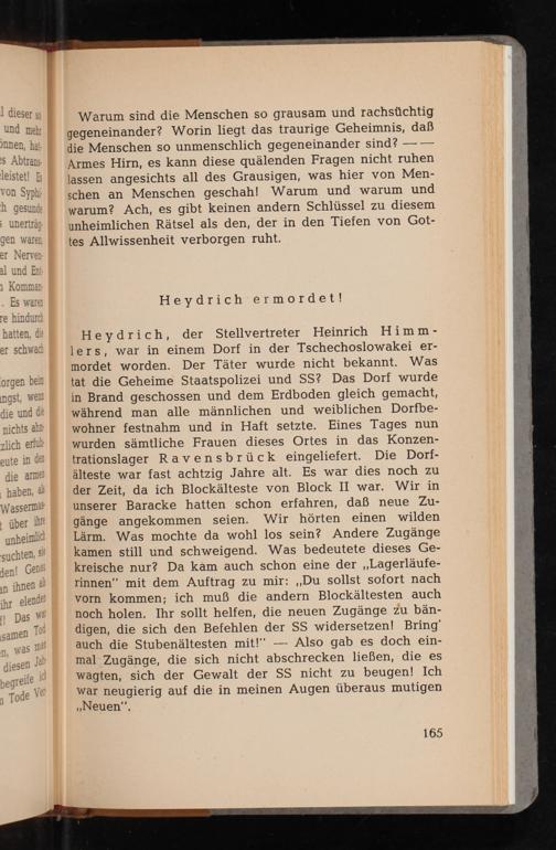 Heydrich, der Stellvertreter Heinrich Himm- lers, war in einem Dorf in der Tschechoslowakei er­mordet worden. Der Täter wurde nicht bekannt. Was tat die Geheime Staatspolizei und SS? Das Dorf wurde in Brand geschossen und dem Erdboden gleich gemacht, während man alle männlichen und weiblichen Dorfbe­wohner festnahm und in Haft setzte. Eines Tages nun wurden sämtliche Frauen dieses Ortes in das Konzen­trationslager Ravensbrück eingeliefert. Die Dorf­älteste war fast achtzig Jahre alt. Es war dies noch zu der Zeit, da ich Blockälteste von Block II war. Wir in unserer Baracke hatten schon erfahren, daß neue Zu­gänge angekommen seien. Wir hörten einen wilden Lärm. Was mochte da wohl los sein? Andere Zugänge kamen still und schweigend. Was bedeutete dieses Ge­kreische nur? Da kam auch schon eine der ,, Lagerläufe­rinnen" mit dem Auftrag zu mir: ,, Du sollst sofort nach vorn kommen; ich muß die andern Blockältesten auch noch holen. Ihr sollt helfen, die neuen Zugänge zu bän­digen, die sich den Befehlen der SS widersetzen! Bring' auch die Stuben ältesten mit!"- Also gab es doch ein­mal Zugänge, die sich nicht abschrecken ließen, die es wagten, sich der Gewalt der SS nicht zu beugen! Ich war neugierig auf die in meinen Augen überaus mutigen ,, Neuen".