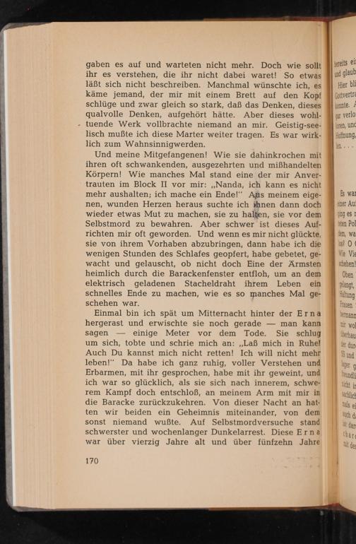 Und meine Mitgefangenen! Wie sie dahinkrochen mit ihren oft schwankenden, ausgezehrten und mißhandelten Körpern! Wie manches Mal stand eine der mir Anvertrauten im Block II vor mir: ,, Nanda, ich kann es nicht mehr aushalten; ich mache ein Ende!" Aus meinem eigenen, wunden Herzen heraus suchte ich ihnen dann doch wieder etwas Mut zu machen, sie zu halten, sie vor dem Selbstmord zu bewahren. Aber schwer ist dieses Aufrichten mir oft geworden. Und wenn es mir nicht glückte, sie von ihrem Vorhaben abzubringen, dann habe ich die wenigen Stunden des Schlafes geopfert, habe gebetet, gewacht und gelauscht, ob nicht doch Eine der Ärmsten heimlich durch die Barackenfenster entfloh, um an dem elektrisch geladenen Stacheldraht ihrem Leben ein schnelles Ende zu machen, wie es so manches Mal geschehen war.