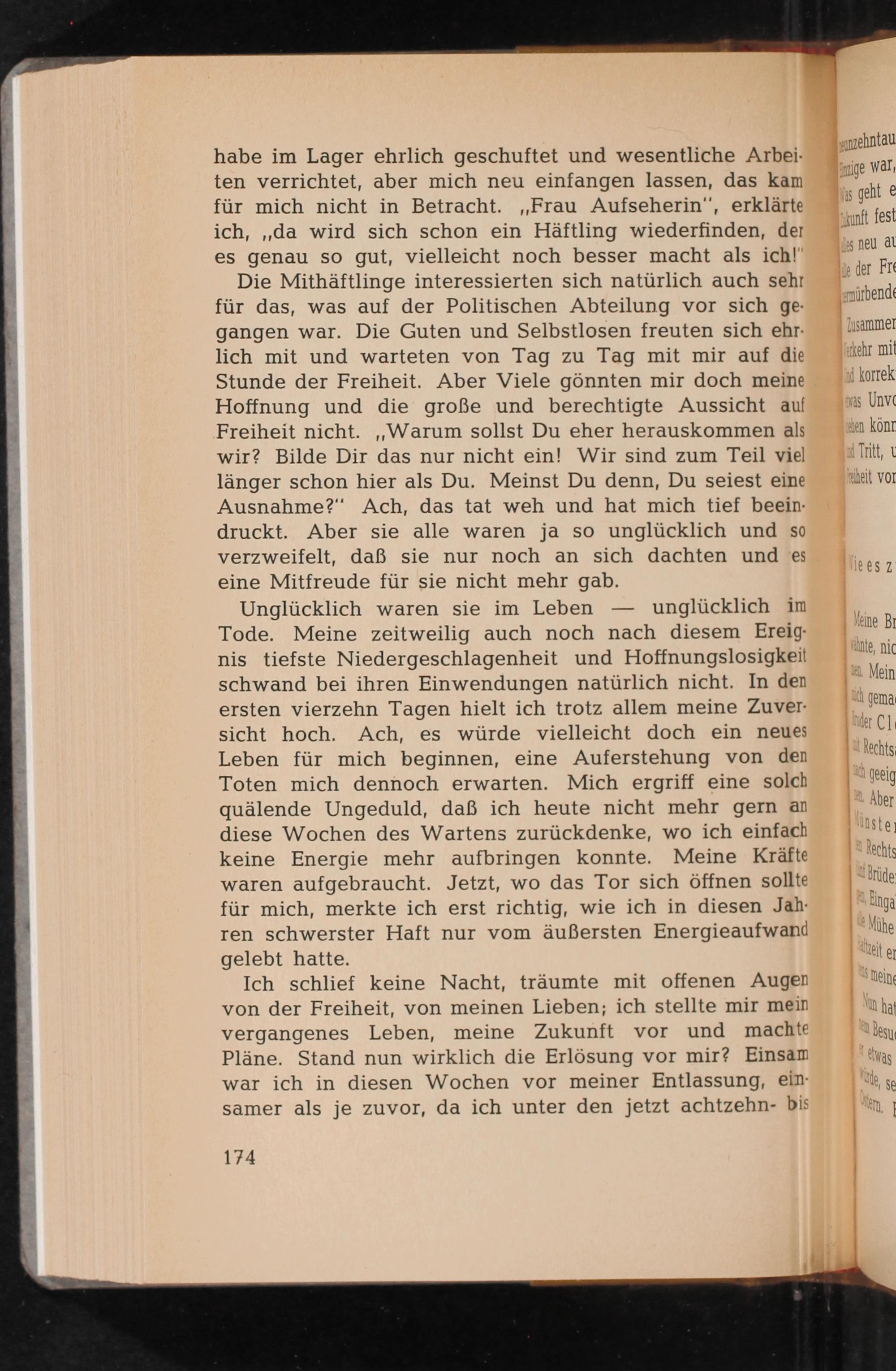 Ich schlief keine Nacht, träumte mit offenen Augen von der Freiheit, von meinen Lieben; ich stellte mir mein vergangenes Leben, meine Zukunft vor und machte Pläne. Stand nun wirklich die Erlösung vor mir? Einsam war ich in diesen Wochen vor meiner Entlassung, ein samer als je zuvor, da ich unter den jetzt achtzehn- bis