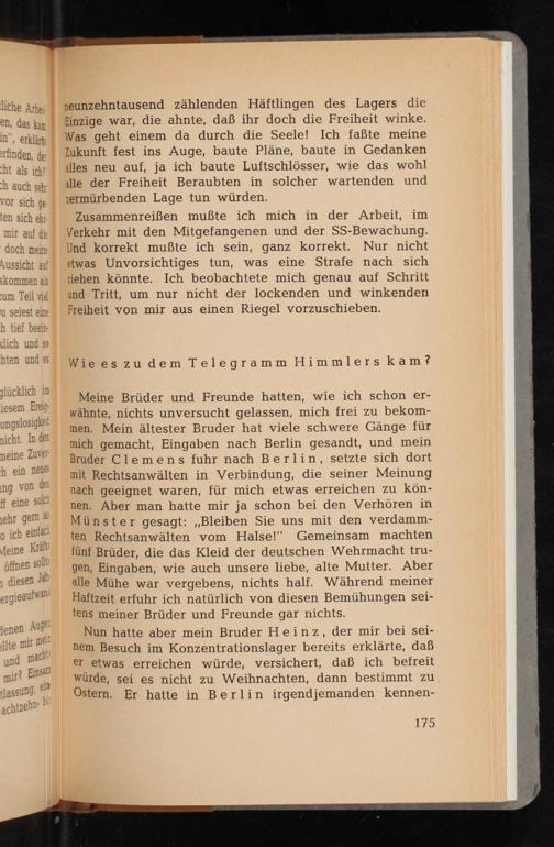 Nun hatte aber mein Bruder Heinz, der mir bei seinem Besuch im Konzentrationslager bereits erklärte, daß er etwas erreichen würde, versichert, daß ich befreit würde, sei es nicht zu Weihnachten, dann bestimmt zu Ostern. Er hatte in Berlin irgendjemanden kennen