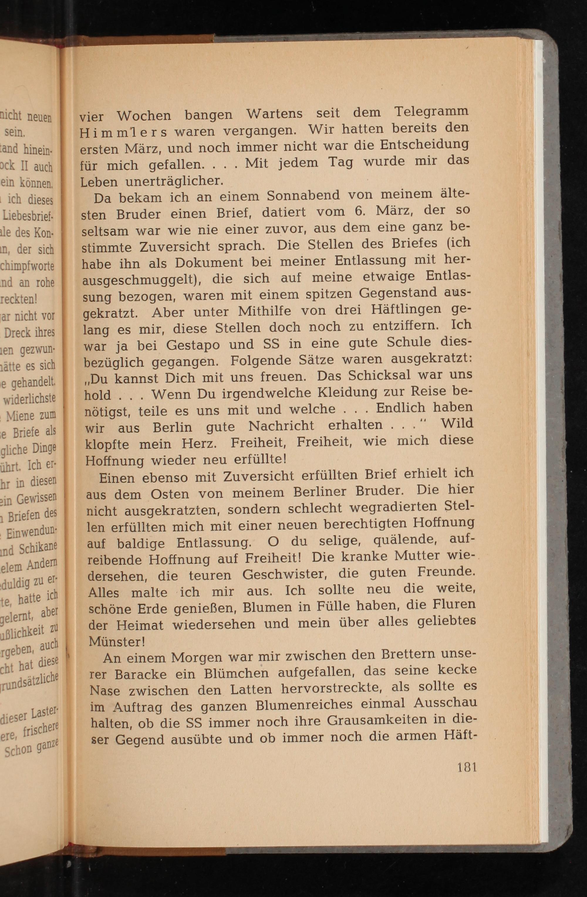 Einen ebenso mit Zuversicht erfüllten Brief erhielt ich aus dem Osten von meinem Berliner Bruder. Die hier nicht ausgekratzten, sondern schlecht wegradierten Stel­len erfüllten mich mit einer neuen berechtigten Hoffnung auf baldige Entlassung. O du selige, quälende, auf­reibende Hoffnung auf Freiheit! Die kranke Mutter wie­dersehen, die teuren Geschwister, die guten Freunde. Alles malte ich mir aus. Ich sollte neu die weite, schöne Erde genießen, Blumen in Fülle haben, die Fluren der Heimat wiedersehen und mein über alles geliebtes Münster !