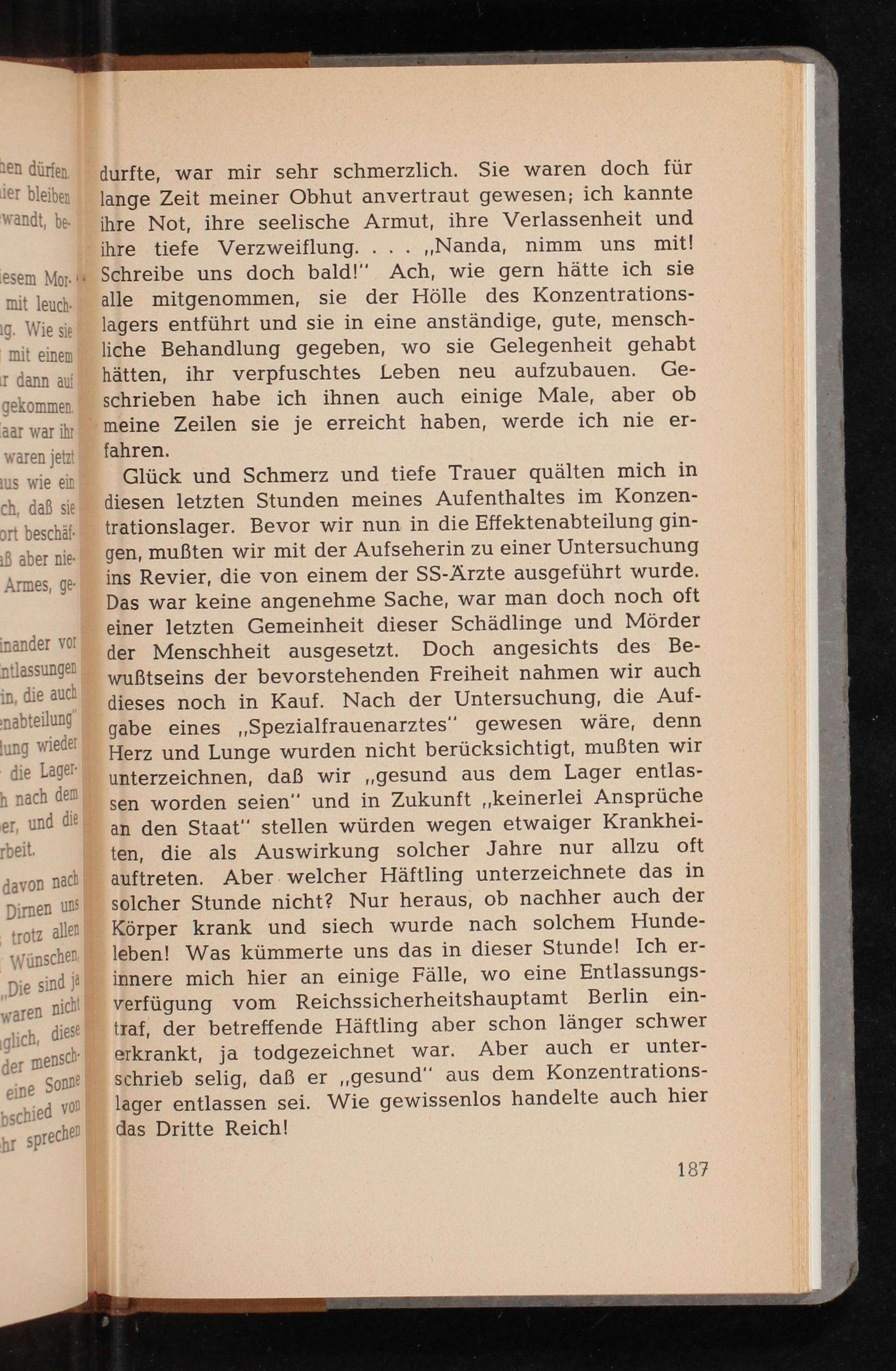 Glück und Schmerz und tiefe Trauer quälten mich in diesen letzten Stunden meines Aufenthaltes im Konzentrationslager. Bevor wir nun in die Effektenabteilung gingen, mußten wir mit der Aufseherin zu einer Untersuchung ins Revier, die von einem der SS - Ärzte ausgeführt wurde. Das war keine angenehme Sache, war man doch noch oft einer letzten Gemeinheit dieser Schädlinge und Mörder der Menschheit ausgesetzt. Doch angesichts des Bewußtseins der bevorstehenden Freiheit nahmen wir auch dieses noch in Kauf. Nach der Untersuchung, die Aufgabe eines Spezialfrauenarztes" gewesen wäre, denn Herz und Lunge wurden nicht berücksichtigt, mußten wir unterzeichnen, daß wir gesund aus dem Lager entlassen worden seien" und in Zukunft ,, keinerlei Ansprüche an den Staat" stellen würden wegen etwaiger Krankheiten, die als Auswirkung solcher Jahre nur allzu oft auftreten. Aber welcher Häftling unterzeichnete das in solcher Stunde nicht? Nur heraus, ob nachher auch der Körper krank und siech wurde nach solchem Hundeleben! Was kümmerte uns das in dieser Stunde! Ich erinnere mich hier an einige Fälle, wo eine Entlassungsverfügung vom Reichssicherheitshauptamt Berlin eintraf, der betreffende Häftling aber schon länger schwer erkrankt, ja todgezeichnet war. Aber auch er unterschrieb selig, daß er ,, gesund" aus dem Konzentrationslager entlassen sei. Wie gewissenlos handelte auch hier das Dritte Reich!