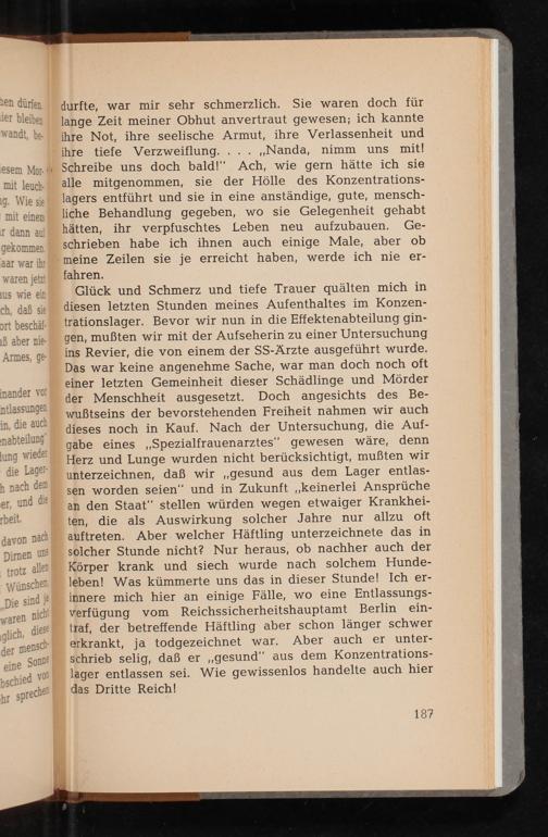 durfte, war mir sehr schmerzlich. Sie waren doch für lange Zeit meiner Obhut anvertraut gewesen; ich kannte ihre Not, ihre seelische Armut, ihre Verlassenheit und ihre tiefe Verzweiflung.. ,, Nanda, nimm uns mit! Schreibe uns doch bald!" Ach, wie gern hätte ich sie alle mitgenommen, sie der Hölle des Konzentrationslagers entführt und sie in eine anständige, gute, menschliche Behandlung gegeben, wo sie Gelegenheit gehabt Gehätten, ihr verpfuschtes Leben neu aufzubauen. schrieben habe ich ihnen auch einige Male, aber ob meine Zeilen sie je erreicht haben, werde ich nie erfahren.