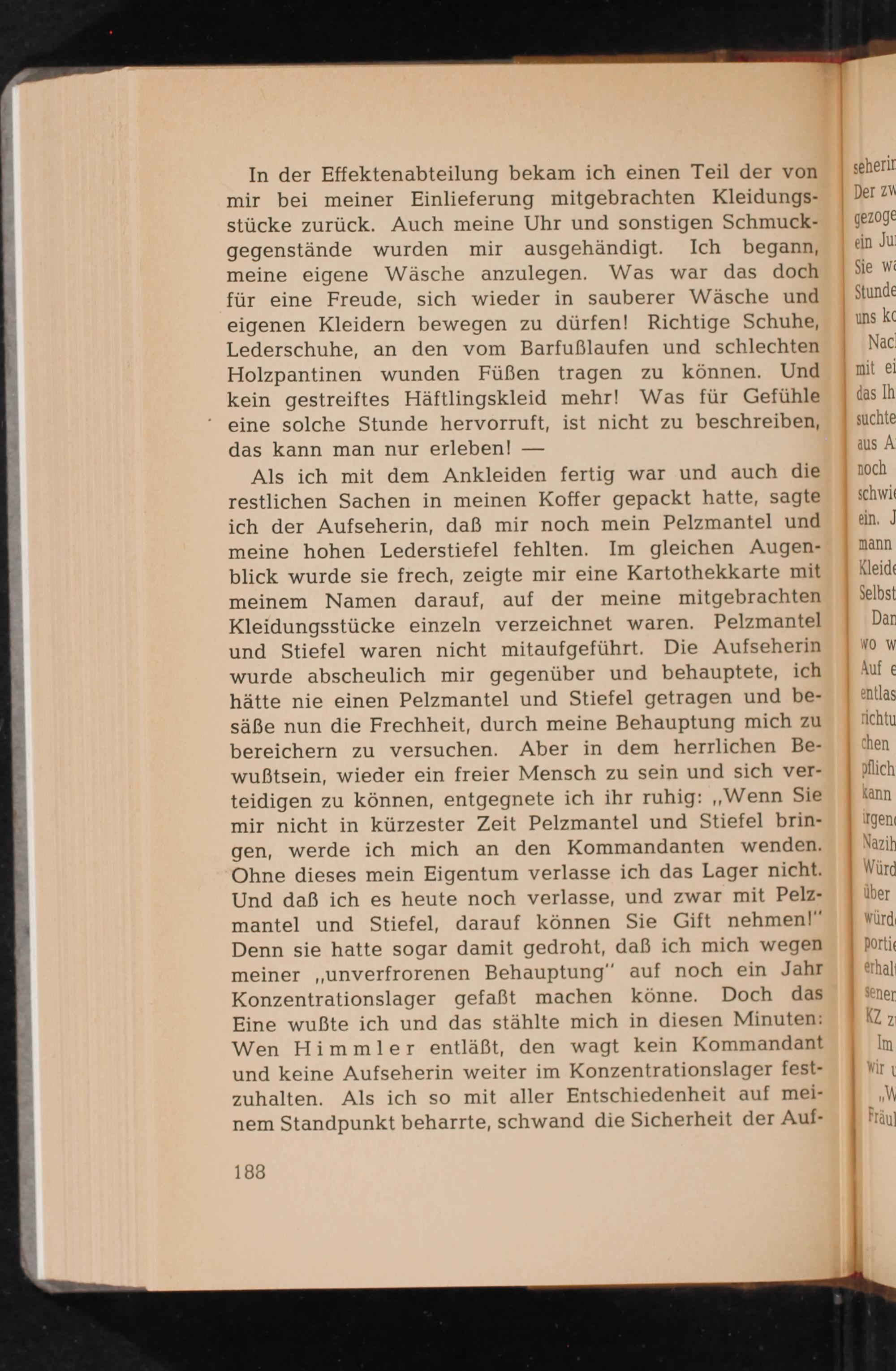 Als ich mit dem Ankleiden fertig war und auch die restlichen Sachen in meinen Koffer gepackt hatte, sagte ich der Aufseherin, daß mir noch mein Pelzmantel und meine hohen Lederstiefel fehlten. Im gleichen Augenblick wurde sie frech, zeigte mir eine Kartothekkarte mit meinem Namen darauf, auf der meine mitgebrachten Kleidungsstücke einzeln verzeichnet waren. Pelzmantel und Stiefel waren nicht mitaufgeführt. Die Aufseherin wurde abscheulich mir gegenüber und behauptete, ich hätte nie einen Pelzmantel und Stiefel getragen und besäẞe nun die Frechheit, durch meine Behauptung mich zu bereichern zu versuchen. Aber in dem herrlichen Bewußtsein, wieder ein freier Mensch zu sein und sich verteidigen zu können, entgegnete ich ihr ruhig: ,, Wenn Sie mir nicht in kürzester Zeit Pelzmantel und Stiefel bringen, werde ich mich an den Kommandanten wenden. Ohne dieses mein Eigentum verlasse ich das Lager nicht. Und daß ich es heute noch verlasse, und zwar mit Pelzmantel und Stiefel, darauf können Sie Gift nehmen!" Denn sie hatte sogar damit gedroht, daß ich mich wegen meiner ,, unverfrorenen Behauptung" auf noch ein Jahr Konzentrationslager gefaßt machen könne. Doch das Eine wußte ich und das stählte mich in diesen Minuten: Wen Himmler entläßt, den wagt kein Kommandant und keine Aufseherin weiter im Konzentrationslager festzuhalten. Als ich so mit aller Entschiedenheit auf meinem Standpunkt beharrte, schwand die Sicherheit der Auf