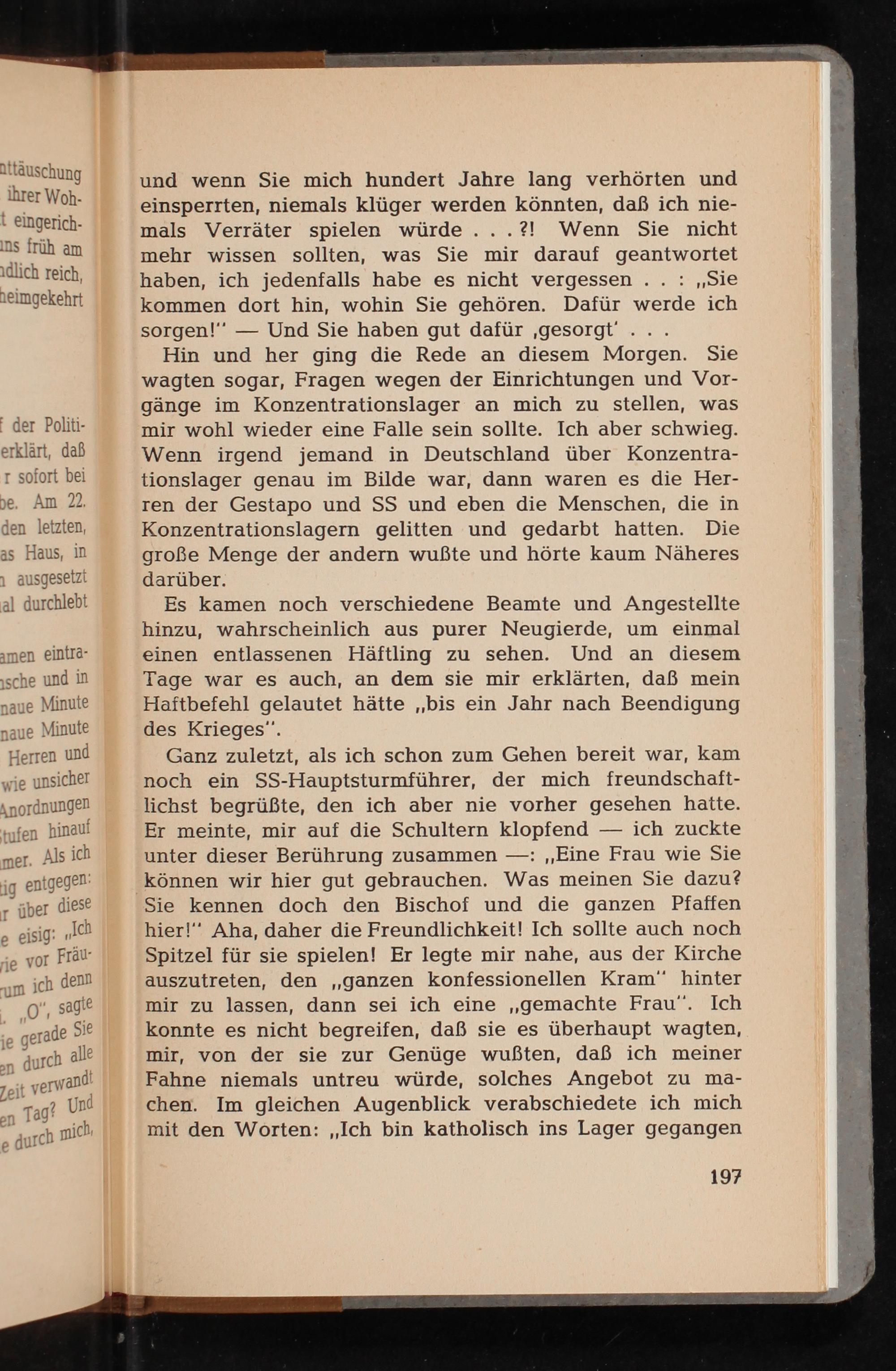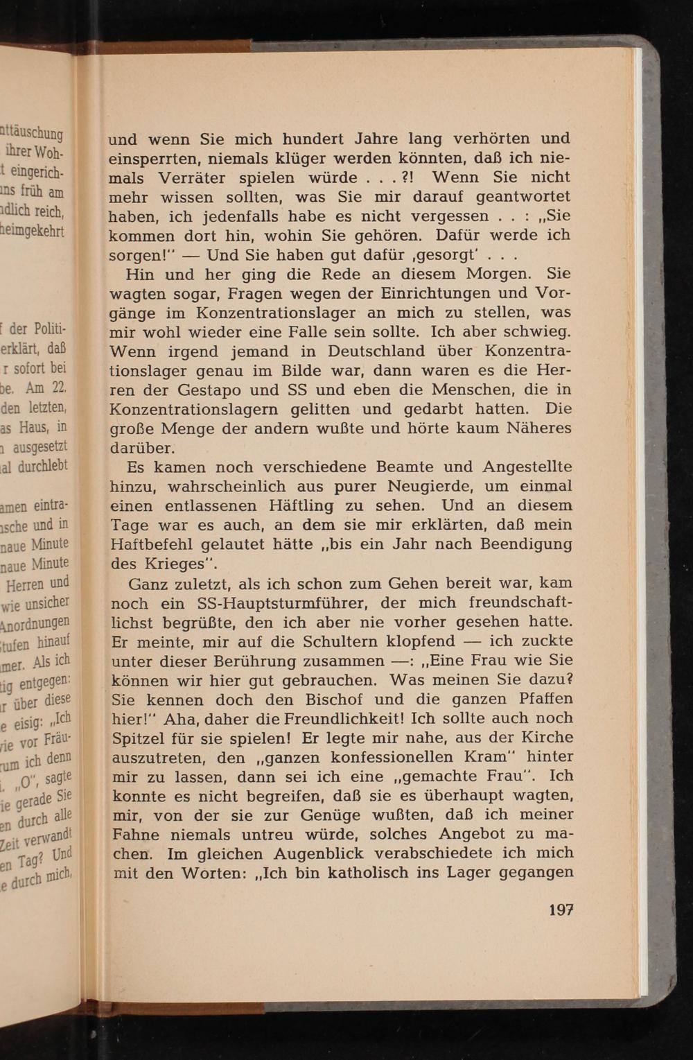Ganz zuletzt, als ich schon zum Gehen bereit war, kam noch ein SS- Hauptsturmführer, der mich freundschaftlichst begrüßte, den ich aber nie vorher gesehen hatte. Er meinte, mir auf die Schultern klopfend ich zuckte unter dieser Berührung zusammen-: ,, Eine Frau wie Sie können wir hier gut gebrauchen. Was meinen Sie dazu? Sie kennen doch den Bischof und die ganzen Pfaffen hier!" Aha, daher die Freundlichkeit! Ich sollte auch noch Spitzel für sie spielen! Er legte mir nahe, aus der Kirche auszutreten, den ,, ganzen konfessionellen Kram" hinter mir zu lassen, dann sei ich eine ,, gemachte Frau". Ich konnte es nicht begreifen, daß sie es überhaupt wagten, mir, von der sie zur Genüge wußten, daß ich meiner Fahne niemals untreu würde, solches Angebot zu machen. Im gleichen Augenblick verabschiedete ich mich mit den Worten: ,, Ich bin katholisch ins Lager gegangen