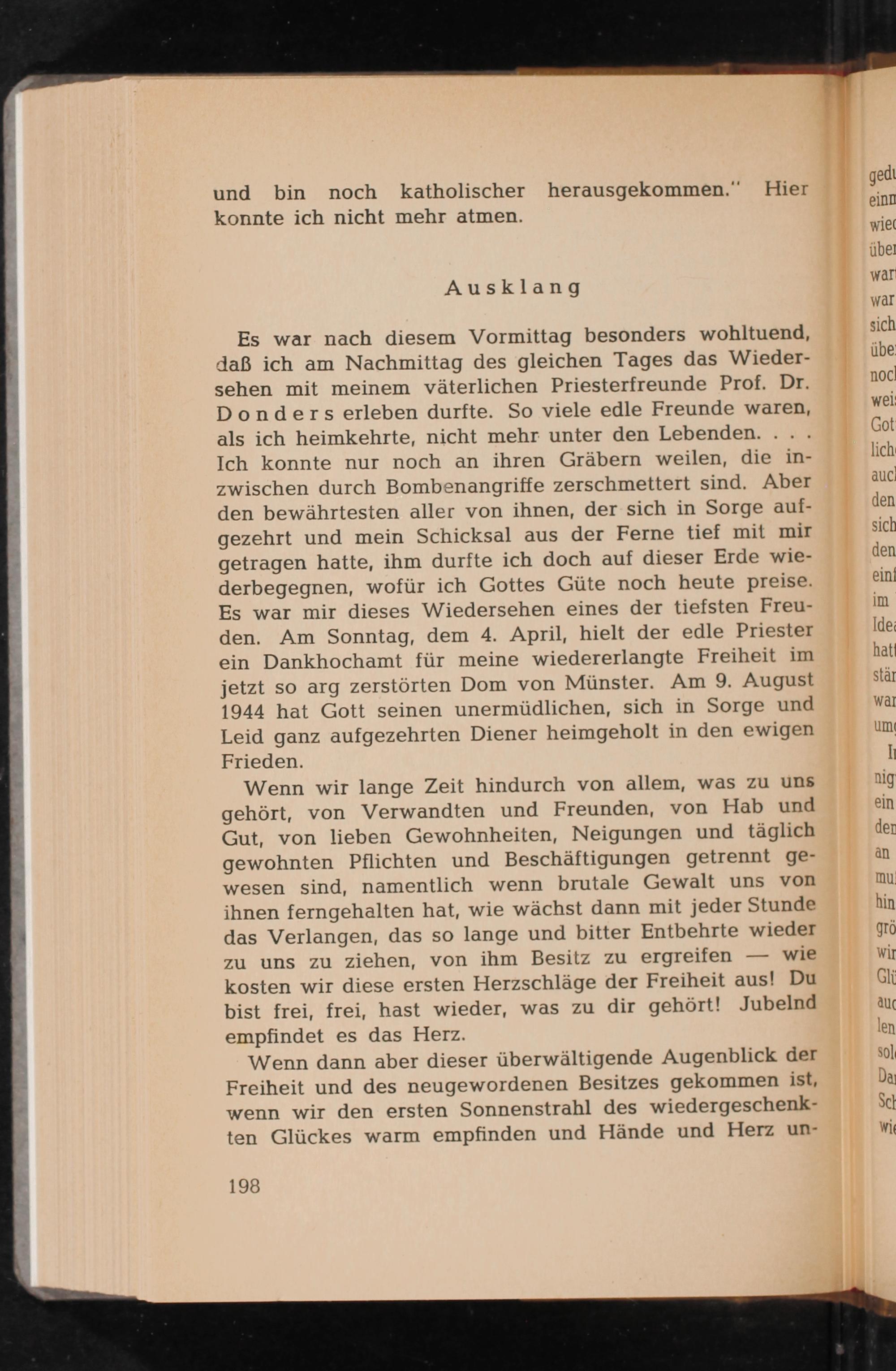 Es war nach diesem Vormittag besonders wohltuend, daß ich am Nachmittag des gleichen Tages das Wiedersehen mit meinem väterlichen Priesterfreunde Prof. Dr. Donders erleben durfte. So viele edle Freunde waren, als ich heimkehrte, nicht mehr unter den Lebenden.... Ich konnte nur noch an ihren Gräbern weilen, die inzwischen durch Bombenangriffe zerschmettert sind. Aber den bewährtesten aller von ihnen, der sich in Sorge aufgezehrt und mein Schicksal aus der Ferne tief mit mir getragen hatte, ihm durfte ich doch auf dieser Erde wiederbegegnen, wofür ich Gottes Güte noch heute preise. Es war mir dieses Wiedersehen eines der tiefsten Freuden. Am Sonntag, dem 4. April, hielt der edle Priester ein Dankhochamt für meine wiedererlangte Freiheit im jetzt so arg zerstörten Dom von Münster . Am 9. August 1944 hat Gott seinen unermüdlichen, sich in Sorge und Leid ganz aufgezehrten Diener heimgeholt in den ewigen Frieden.