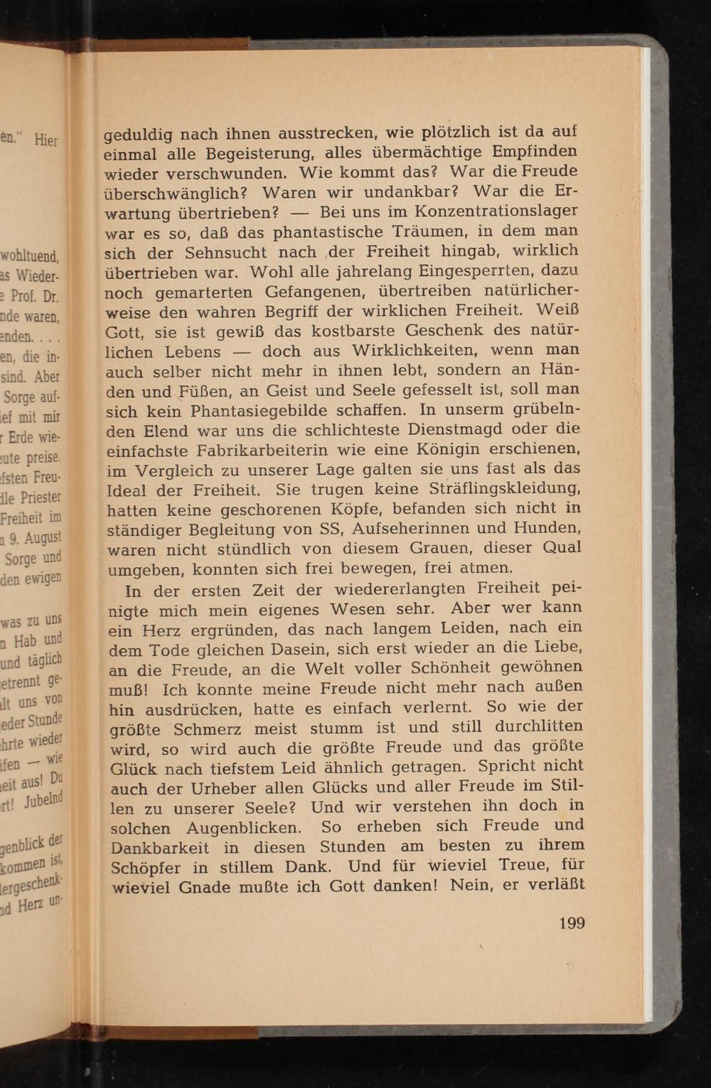 In der ersten Zeit der wiedererlangten Freiheit peinigte mich mein eigenes Wesen sehr. Aber wer kann ein Herz ergründen, das nach langem Leiden, nach ein dem Tode gleichen Dasein, sich erst wieder an die Liebe, an die Freude, an die Welt voller Schönheit gewöhnen muß! Ich konnte meine Freude nicht mehr nach außen hin ausdrücken, hatte es einfach verlernt. So wie der größte Schmerz meist stumm ist und still durchlitten wird, so wird auch die größte Freude und das größte Glück nach tiefstem Leid ähnlich getragen. Spricht nicht auch der Urheber allen Glücks und aller Freude im Stillen zu unserer Seele? Und wir verstehen ihn doch in solchen Augenblicken. So erheben sich Freude und Dankbarkeit in diesen Stunden am besten zu ihrem Schöpfer in stillem Dank. Und für wieviel Treue, für wieviel Gnade mußte ich Gott danken! Nein, er verläßt
