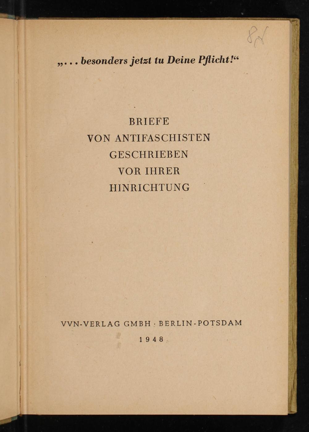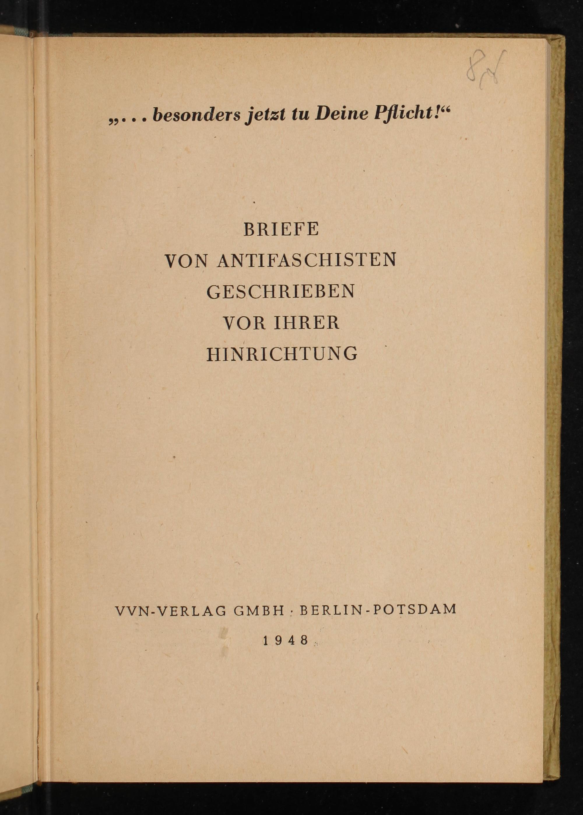 3... besonders jetzt tu Deine Pflicht!“ BRIEFE VON ANTIFASCHISTEN GESCHRIEBEN VOR IHRER HINRICHTUNG VVN-VERLAG GMBH- BERLIN -POTSDAM 1948.