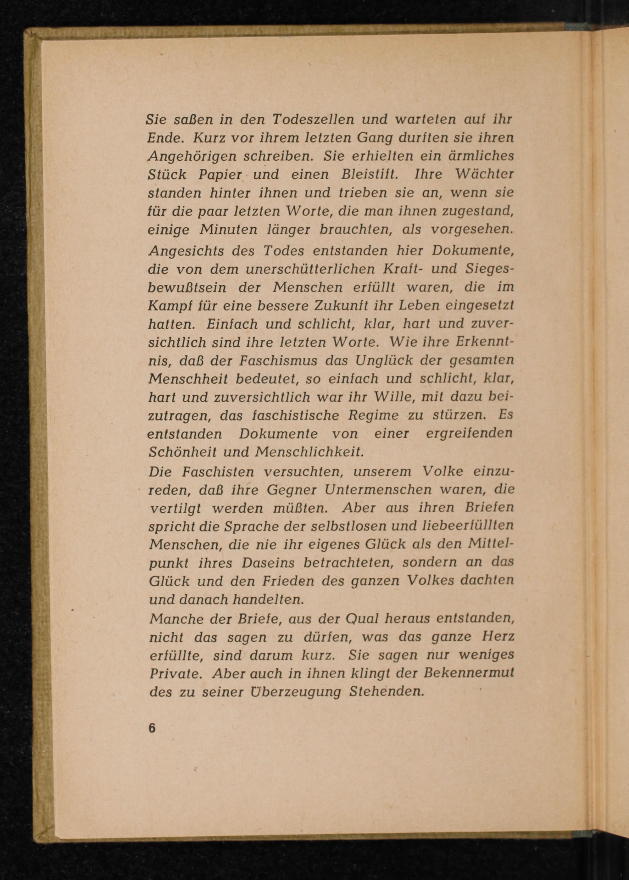 Sie saßen in den Todeszellen und warteten auf ihr Ende. Kurz vor ihrem letzten Gang durften sie ihren Angehörigen schreiben. Sie erhielten ein ärmliches Stück Papier und einen Bleistift. Ihre Wächter standen hinter ihnen und trieben sie an, wenn sie für die paar letzten Worte, die man ihnen zugestand, einige Minuten länger brauchten, als vorgesehen. Angesichts des Todes entstanden hier Dokumente, die von dem unerschütterlichen Kraft- und Sieges­bewußtsein der Menschen erfüllt waren, die im Kampf für eine bessere Zukunft ihr Leben eingesetzt hatten. Einfach und schlicht, klar, hart und zuver­sichtlich sind ihre letzten Worte. Wie ihre Erkennt­nis, daß der Faschismus das Unglück der gesamten Menschheit bedeutet, so einfach und schlicht, klar, hart und zuversichtlich war ihr Wille, mit dazu bei­zutragen, das faschistische Regime zu stürzen. Es entstanden Dokumente von einer ergreifenden Schönheit und Menschlichkeit.