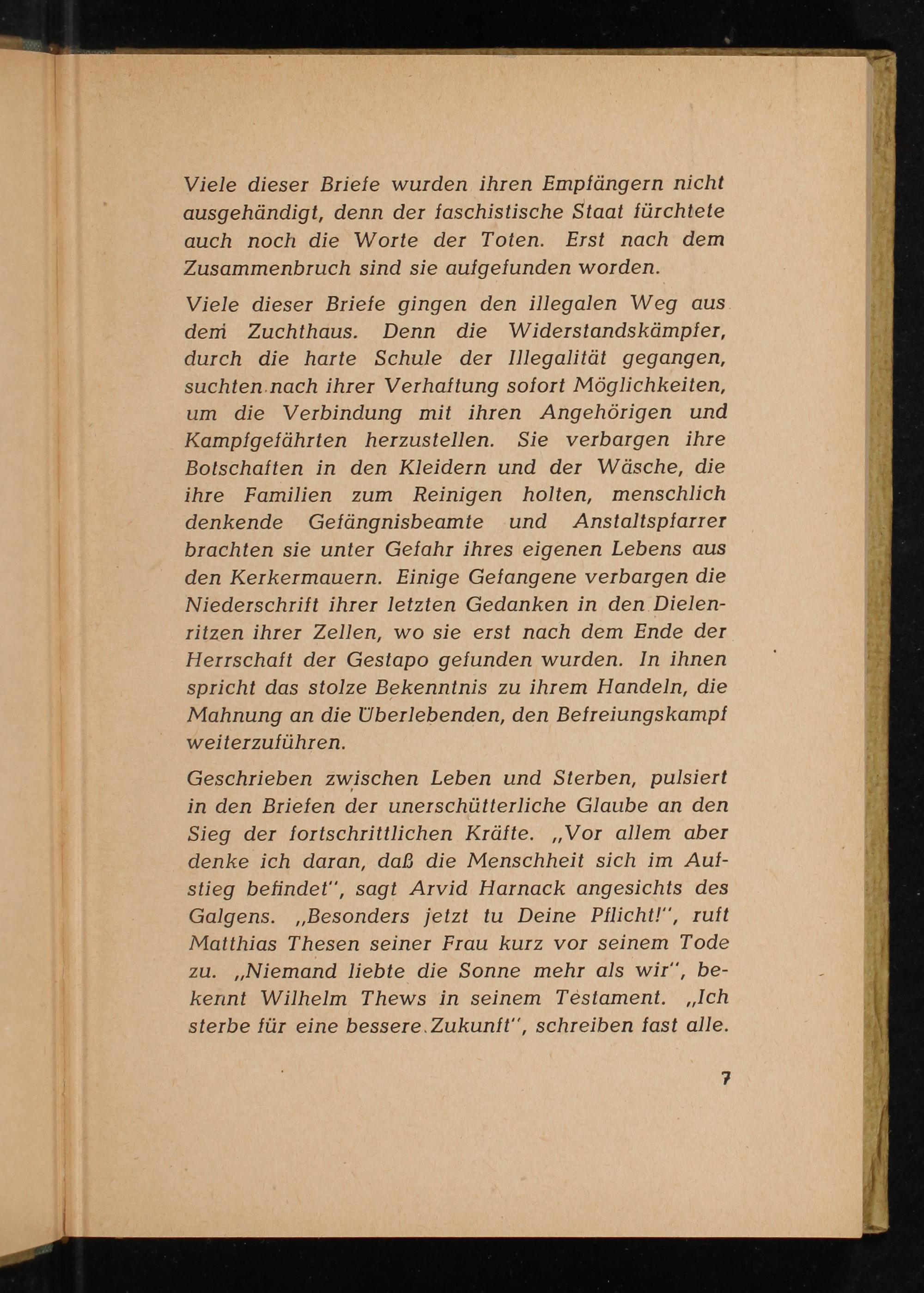Geschrieben zwischen Leben und Sterben, pulsiert in den Briefen der unerschütterliche Glaube an den Sieg der fortschrittlichen Kräfte. ,, Vor allem aber denke ich daran, daß die Menschheit sich im Auf­stieg befindet", sagt Arvid Harnack angesichts des Galgens. ,, Besonders jetzt tu Deine Pflicht!", ruft Matthias Thesen seiner Frau kurz vor seinem Tode zu. ,, Niemand liebte die Sonne mehr als wir", be­kennt Wilhelm Thews in seinem Testament. ,, Ich sterbe für eine bessere Zukunft", schreiben fast alle.