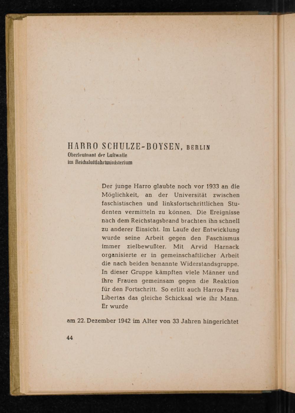 Der junge Harro glaubte noch vor 1933 an die Möglichkeit, an der Universität zwischen faschistischen und linksfortschrittlichen Studenten vermitteln zu können. Die Ereignisse nach dem Reichstagsbrand brachten ihn schnell zu anderer Einsicht. Im Laufe der Entwicklung wurde seine Arbeit gegen den Faschismus immer zielbewußter. Mit Arvid Harnack organisierte er in gemeinschaftlicher Arbeit die nach beiden benannte Widerstandsgruppe. In dieser Gruppe kämpften viele Männer und ihre Frauen gemeinsam gegen die Reaktion für den Fortschritt. So erlitt auch Harros Frau Libertas das gleiche Schicksal wie ihr Mann. Er wurde