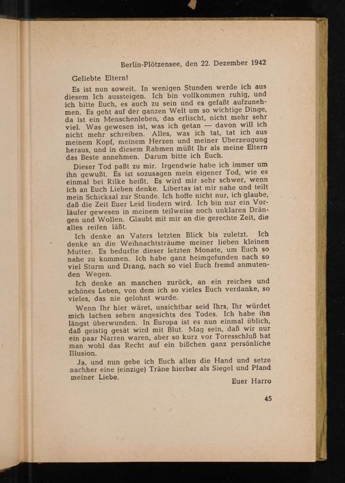 Dieser Tod paßt zu mir. Irgendwie habe ich immer um ihn gewußt. Es ist sozusagen mein eigener Tod, wie es einmal bei Rilke heißt. Es wird mir sehr schwer, wenn ich an Euch Lieben denke. Libertas ist mir nahe und teilt mein Schicksal zur Stunde. Ich hoffe nicht nur, ich glaube, daß die Zeit Euer Leid lindern wird. Ich bin nur ein Vorläufer gewesen in meinem teilweise noch unklaren Drängen und Wollen. Glaubt mit mir an die gerechte Zeit, die alles reifen läßt.