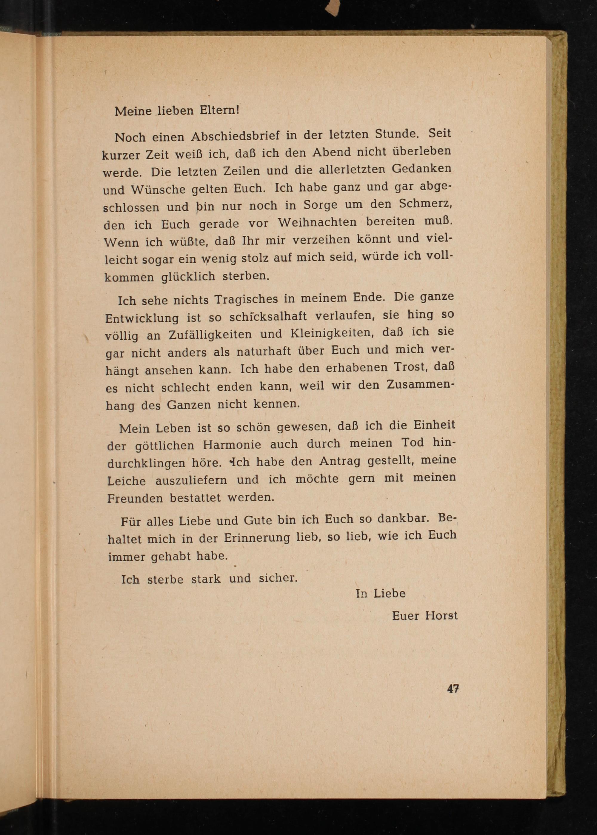 Noch einen Abschiedsbrief in der letzten Stunde. Seit kurzer Zeit weiß ich, daß ich den Abend nicht überleben werde. Die letzten Zeilen und die allerletzten Gedanken und Wünsche gelten Euch. Ich habe ganz und gar abgeschlossen und bin nur noch in Sorge um den Schmerz, den ich Euch gerade vor Weihnachten bereiten muß. Wenn ich wüßte, daß Ihr mir verzeihen könnt und vielleicht sogar ein wenig stolz auf mich seid, würde ich vollkommen glücklich sterben.